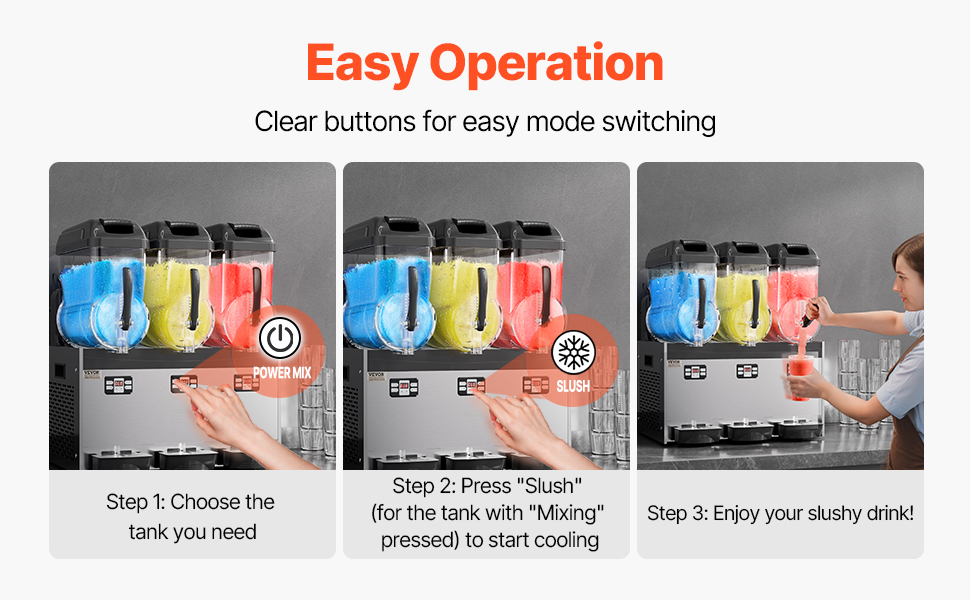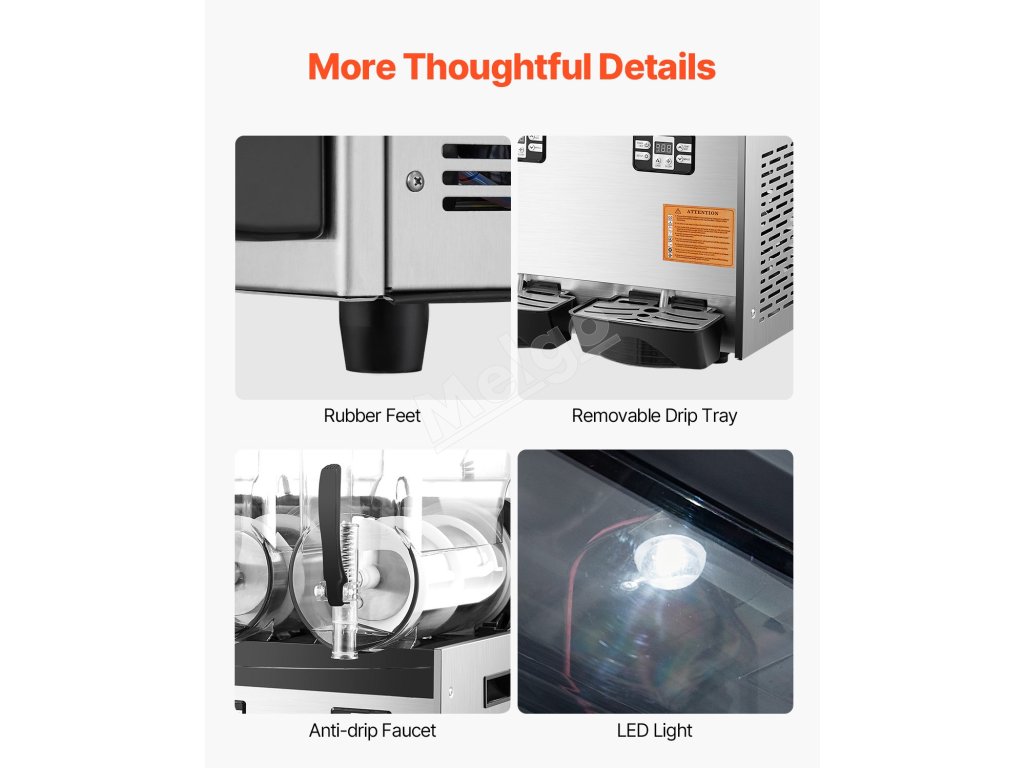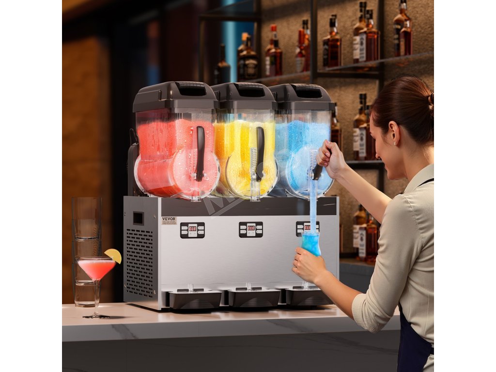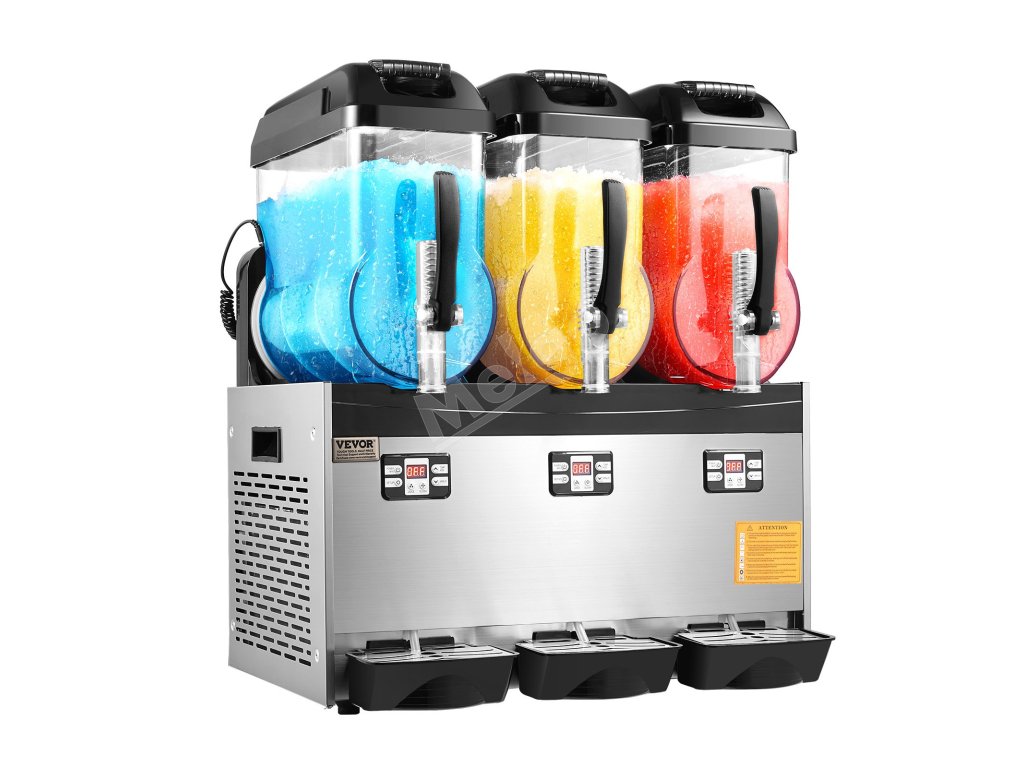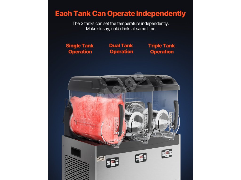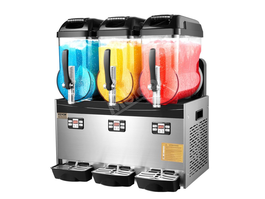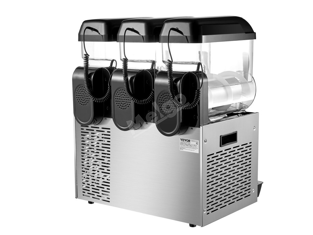 Tento komerčný prístroj na výrobu slushy má tri nádrže s objemom 12 l / 3,17 GAL, telo z nehrdzavejúcej ocele a nádrž z PC, ktoré ponúkajú odolné a zdravotne nezávadné materiály.