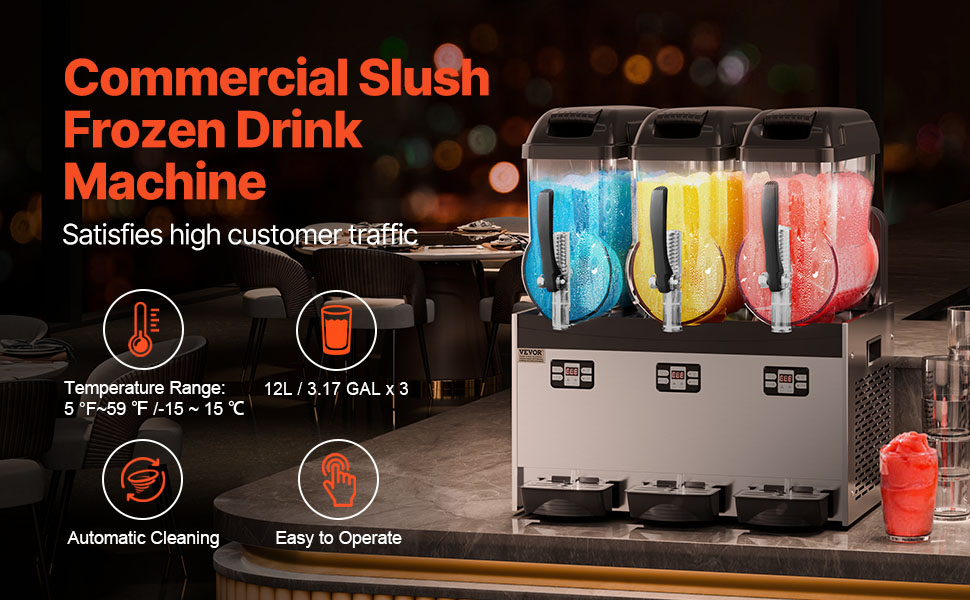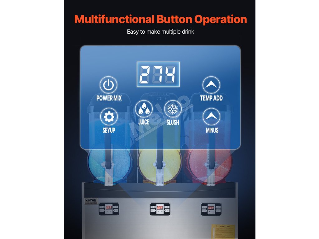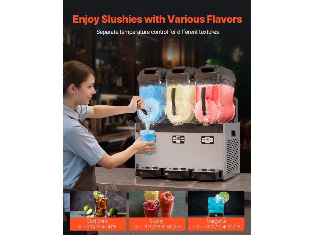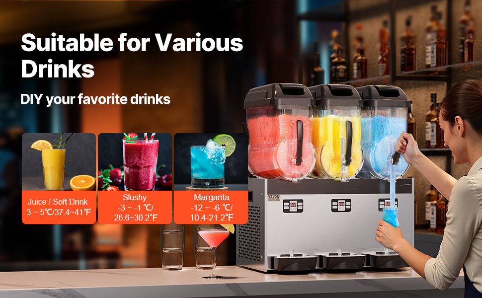 Vylepšený stroj na výrobu slushy poskytuje rozsah nastavenia teploty 5 ~ 59℉ / -15 ~ 15 ℃, takže je vhodný na prípravu rôznych nápojov vrátane džúsov, ľadovej kávy, čaju a dokonca aj margarity.