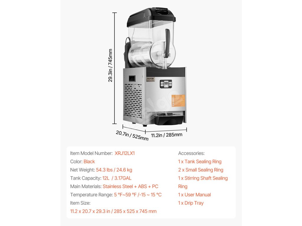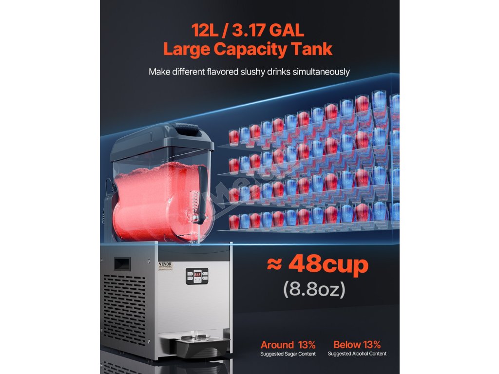 Tento komerčný prístroj na výrobu slushy má nádrž s objemom 12 l / 3,17 GAL, telo z nehrdzavejúcej ocele a nádrž z PC, ktoré ponúkajú odolné a zdravotne nezávadné materiály.