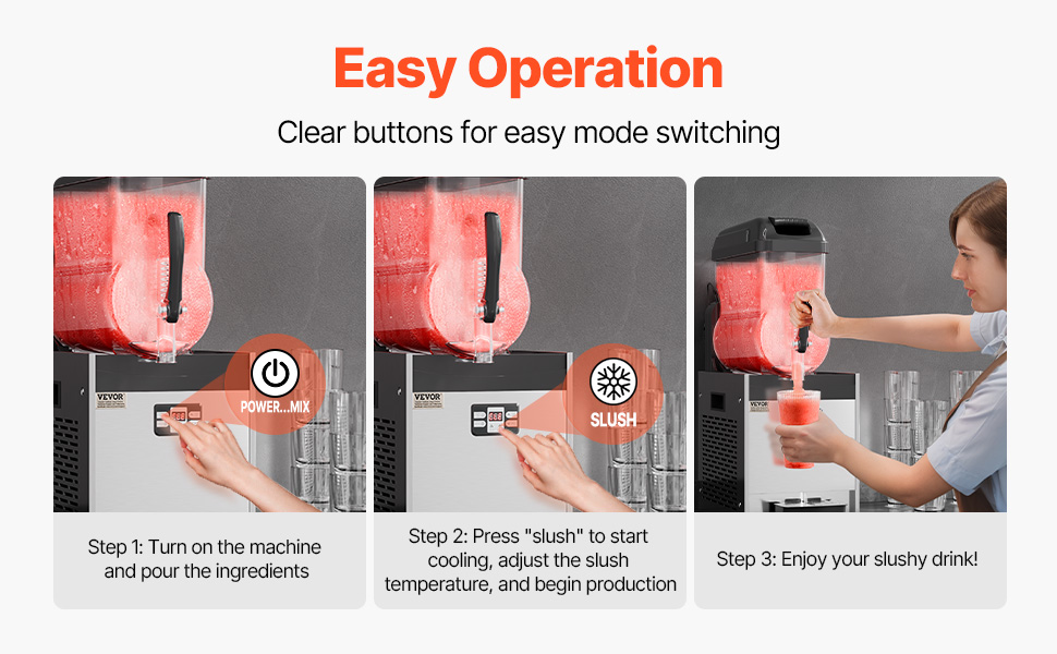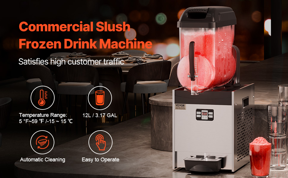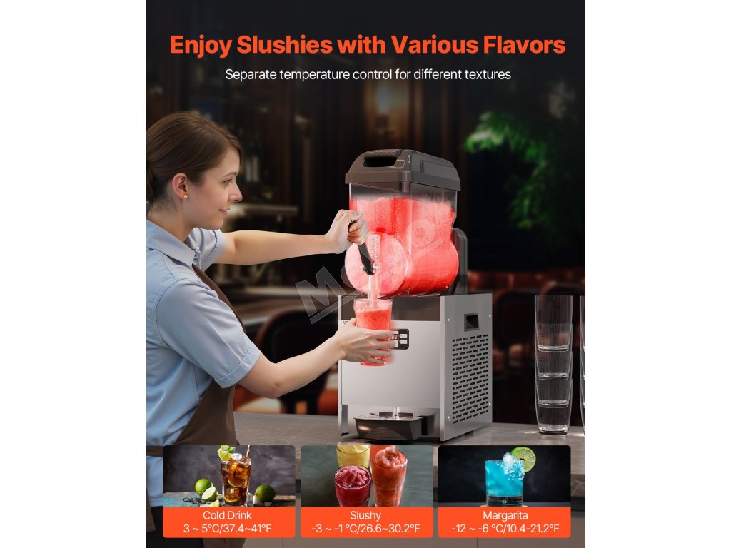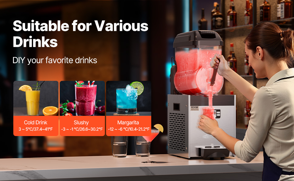 Vylepšený stroj na prípravu slushy poskytuje rozsah nastavenia teploty 5 ~ 59℉ / -15 ~ 15 ℃, vďaka čomu je vhodný na prípravu rôznych nápojov vrátane džúsov, ľadovej kávy, čaju a dokonca aj margarity.