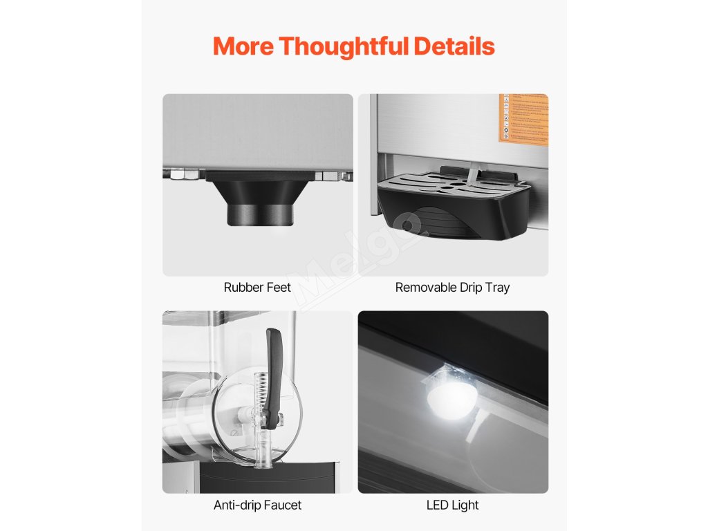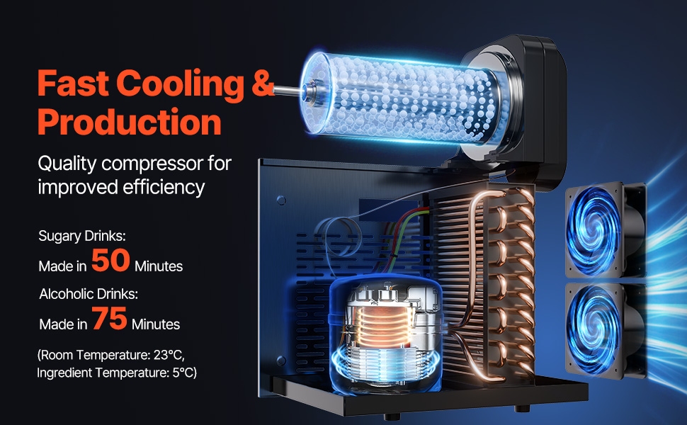 Tento komerčný prístroj na výrobu slushie je vybavený vysokokvalitným kompresorom a celomedeným kondenzátorom, vďaka čomu sa rýchlo ochladzuje, je energeticky účinný, pracuje stabilne a s nízkou hlučnosťou.