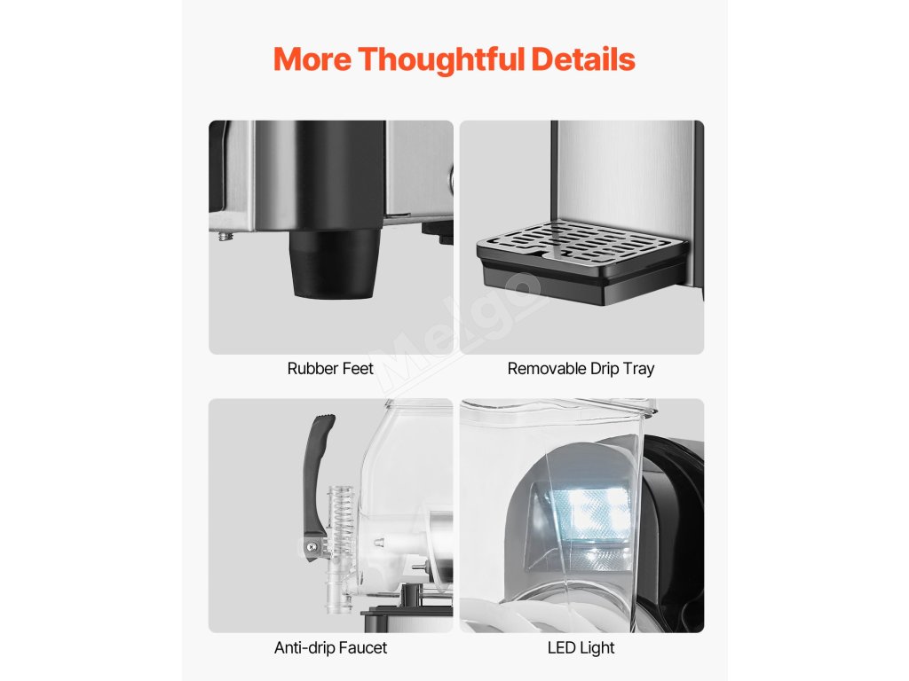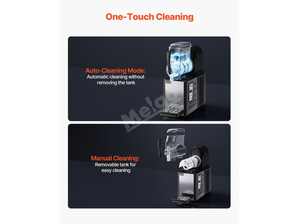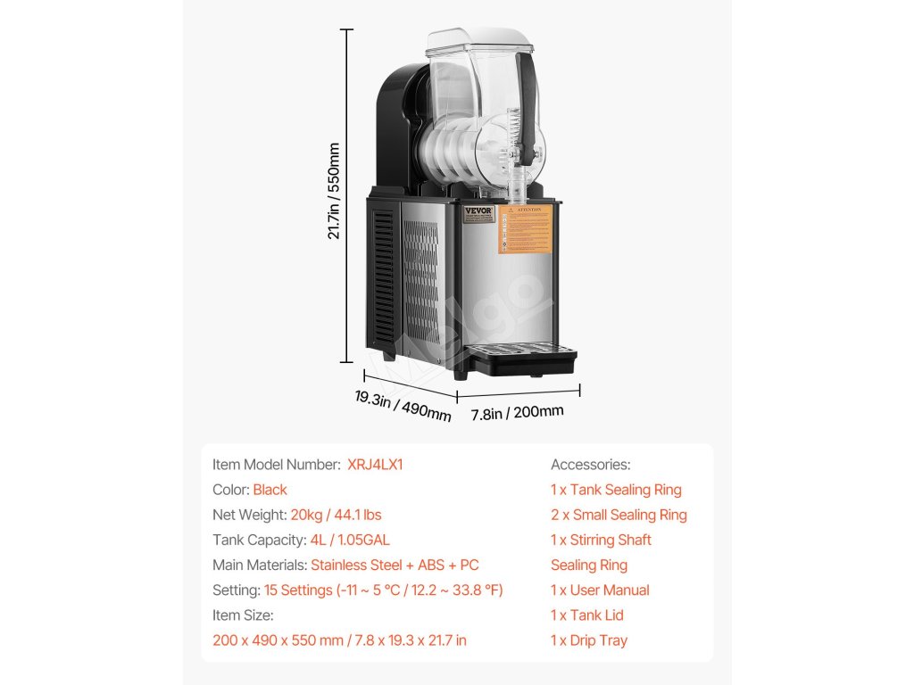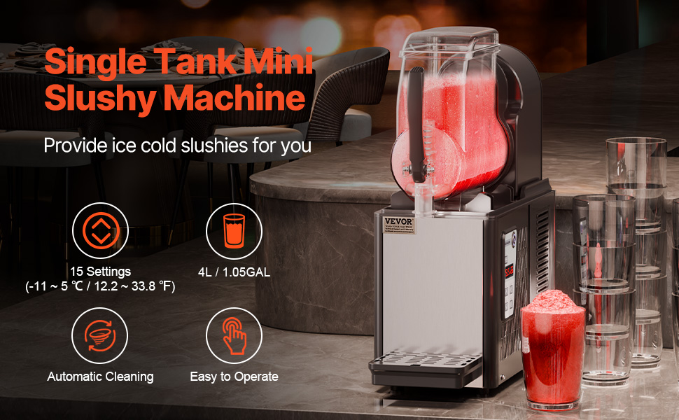Tento mini prístroj na výrobu slushy má nádrž s objemom 4 l / 1,05 GAL, telo z nehrdzavejúcej ocele a nádrž z PC, ktoré ponúkajú odolné a zdravé materiály.