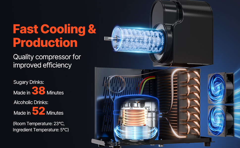Tento mini prístroj na prípravu slushie je vybavený vysokokvalitným kompresorom a celomedeným kondenzátorom, vďaka čomu sa rýchlo ochladzuje, je energeticky účinný, pracuje stabilne a s nízkou hlučnosťou.