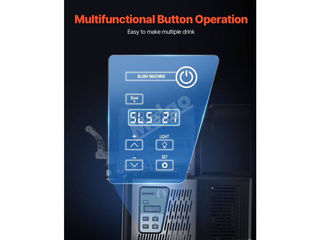 Vďaka intuitívnym ikonám a jednoduchým tlačidlám je prepínanie medzi prevádzkovými režimami hračkou. Digitálny displej uľahčuje sledovanie stavu výrobníka slushy. Rozšírené miešadlo na miešanie sa otáča o 360°, čím znižuje množstvo usadenín vo všetkých nápojoch.