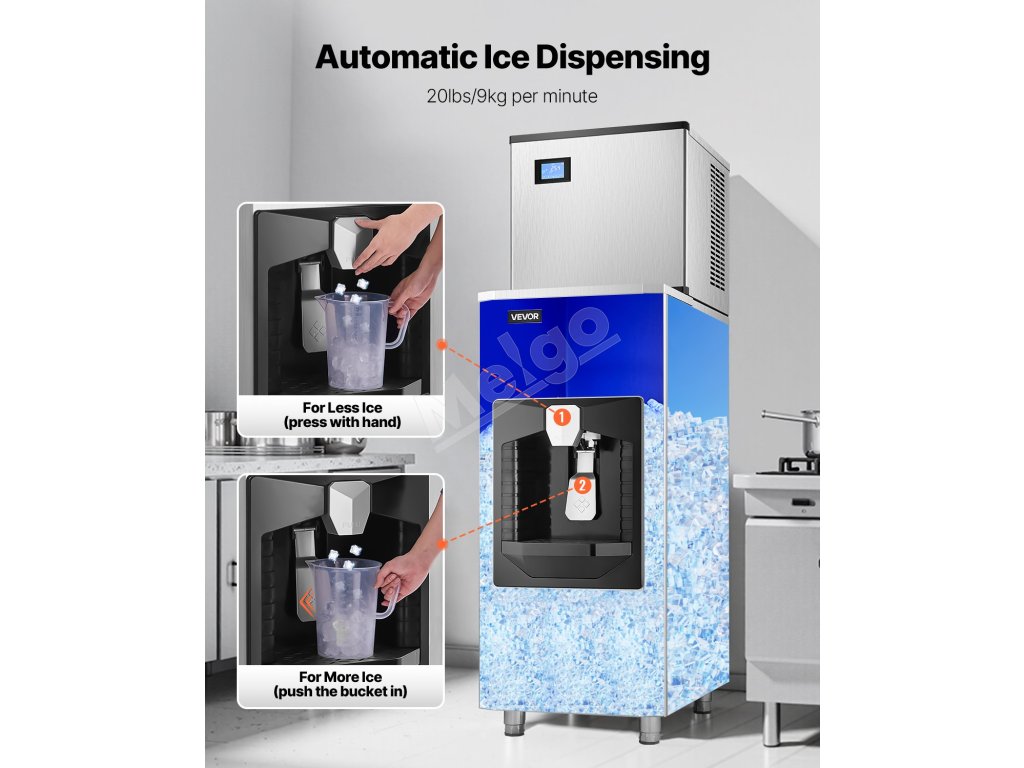 Komerčný zásobník na ľad je vybavený funkciou automatického dávkovania ľadu jednoduchým stlačením. Vybavený drvič dokáže automaticky rozdrviť kocky ľadu pre výdaj bez zaseknutia.