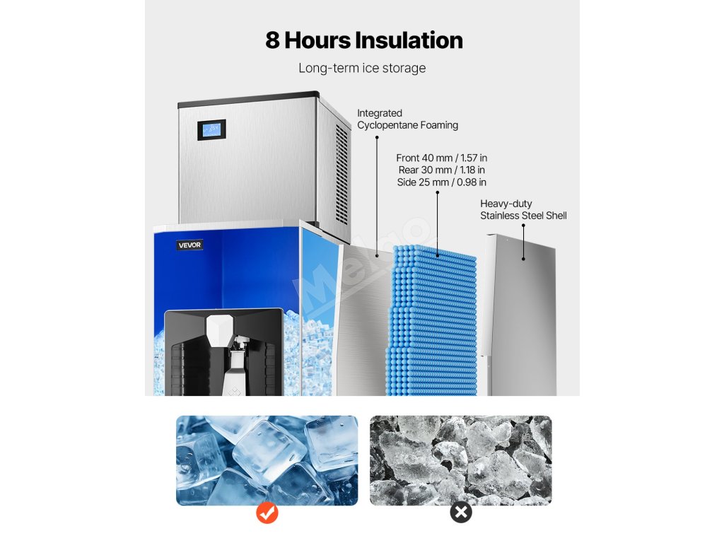 Hlavná jednotka a zásobník na ľad spolu tvoria kompletný komerčný výrobník ľadu. Dodávame hlavné jednotky s rôznymi výkonmi na výrobu ľadu, ktoré je potrebné zakúpiť samostatne. (Kompatibilné s akoukoľvek veľkosťou hlavnej jednotky na trhu)