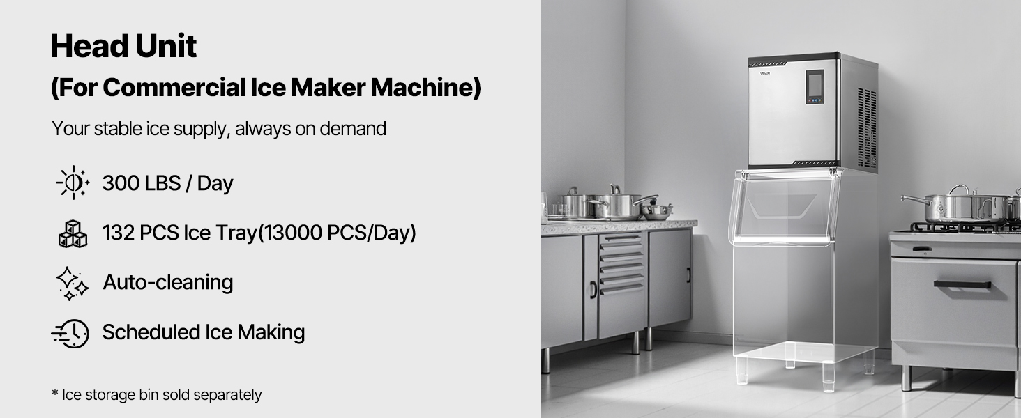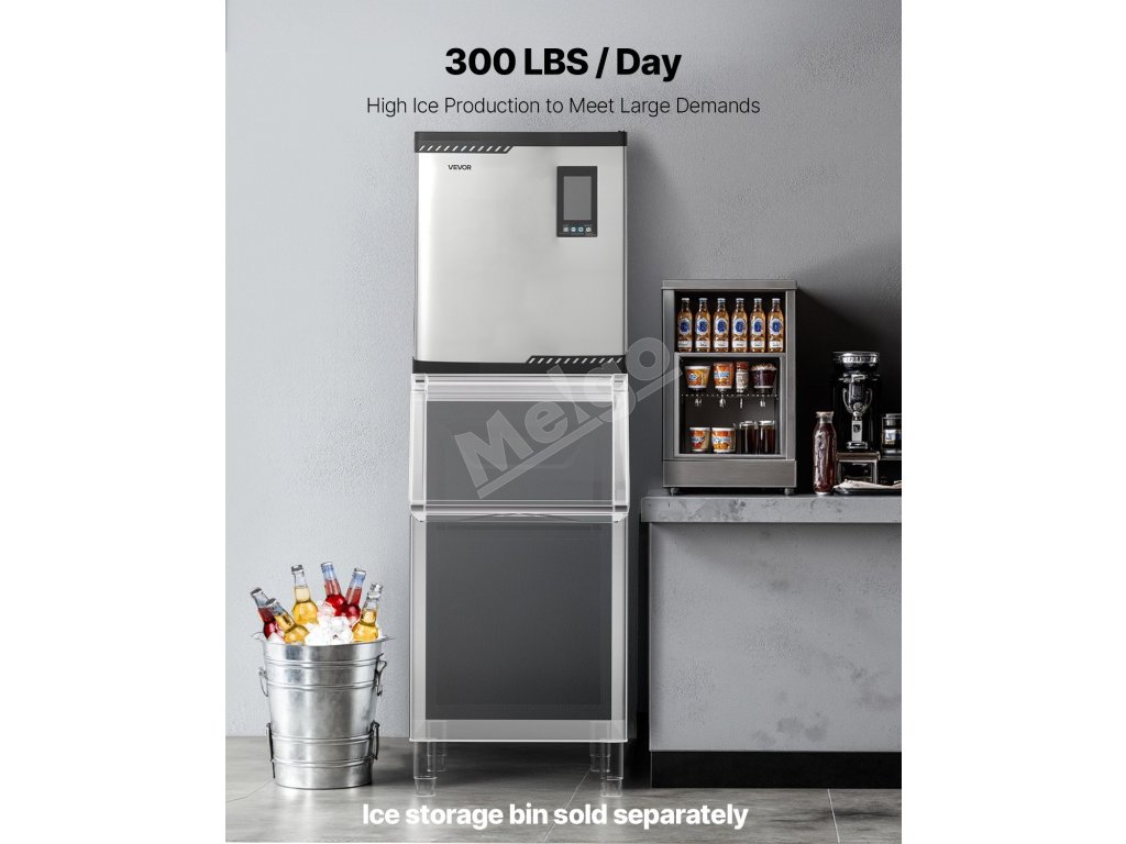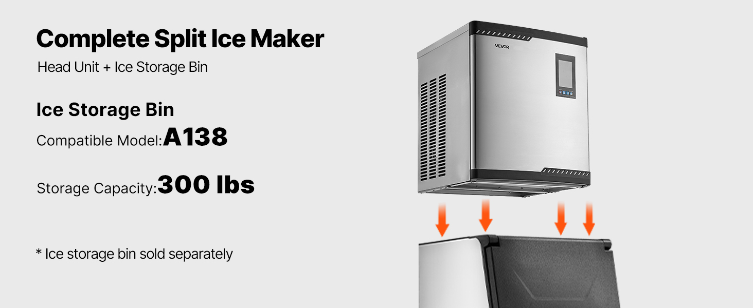 Hlavná jednotka a zásobník na ľad spolu tvoria kompletný komerčný výrobník ľadu. Ponúkame konfiguráciu zásobníka na ľad s hmotnosťou 300 libier / 136 kg, ktorý sa predáva samostatne.