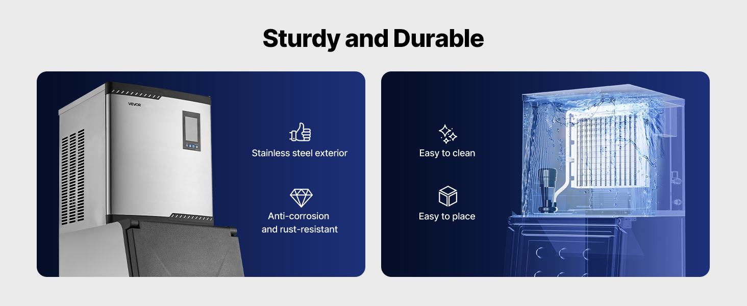 Zariadenie na výrobu ľadu pre komerčné účely má zdokonalený plášť z nehrdzavejúcej ocele, ktorý je odolný voči korózii a hrdzi, ľahko sa čistí a je vysoko odolný.