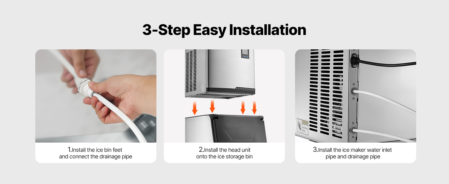 Výrobník ľadu sa ľahko inštaluje a gravitačná konštrukcia odtoku zabezpečuje rýchle a účinné vypúšťanie vody.