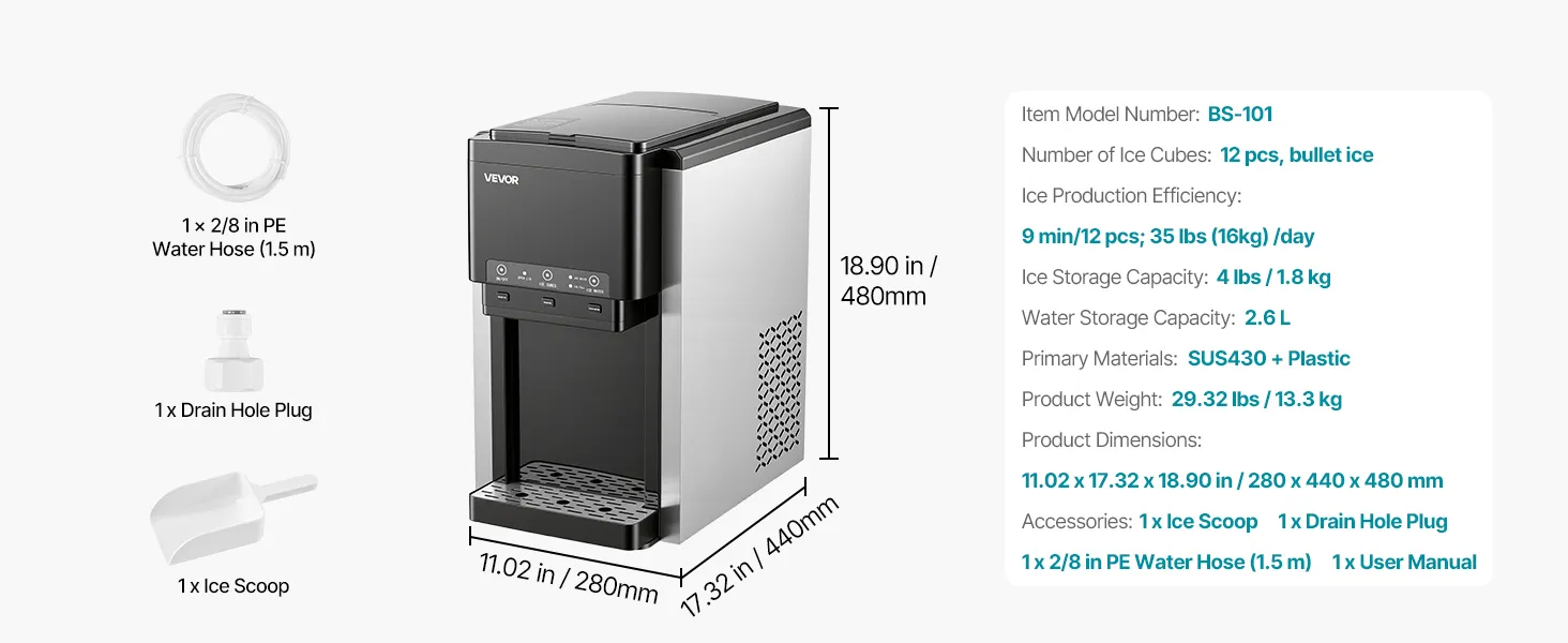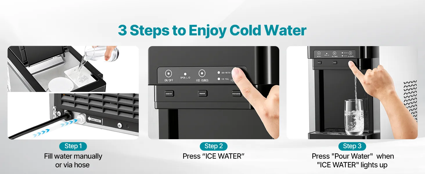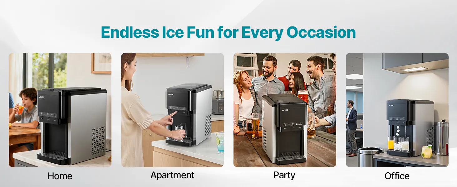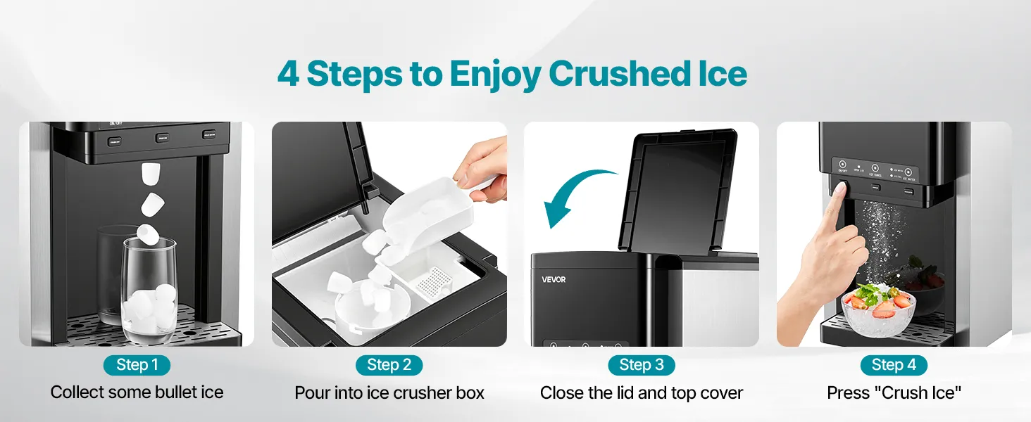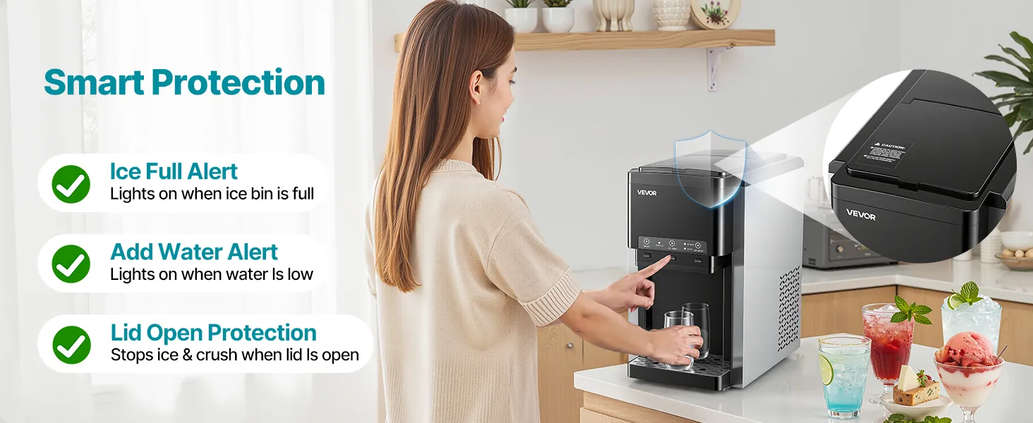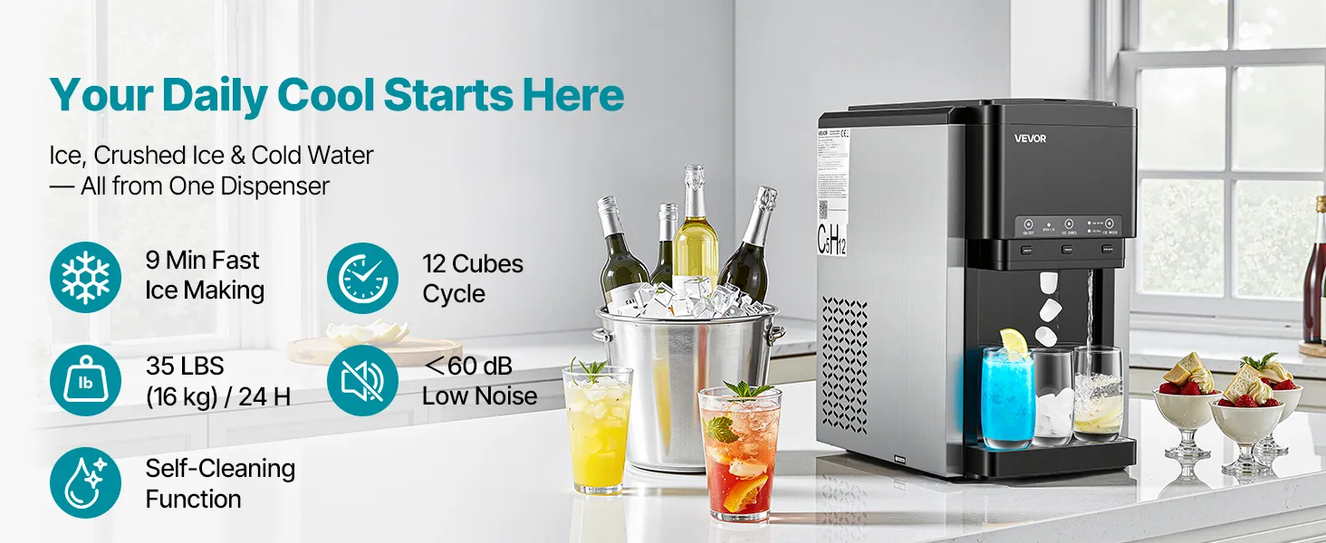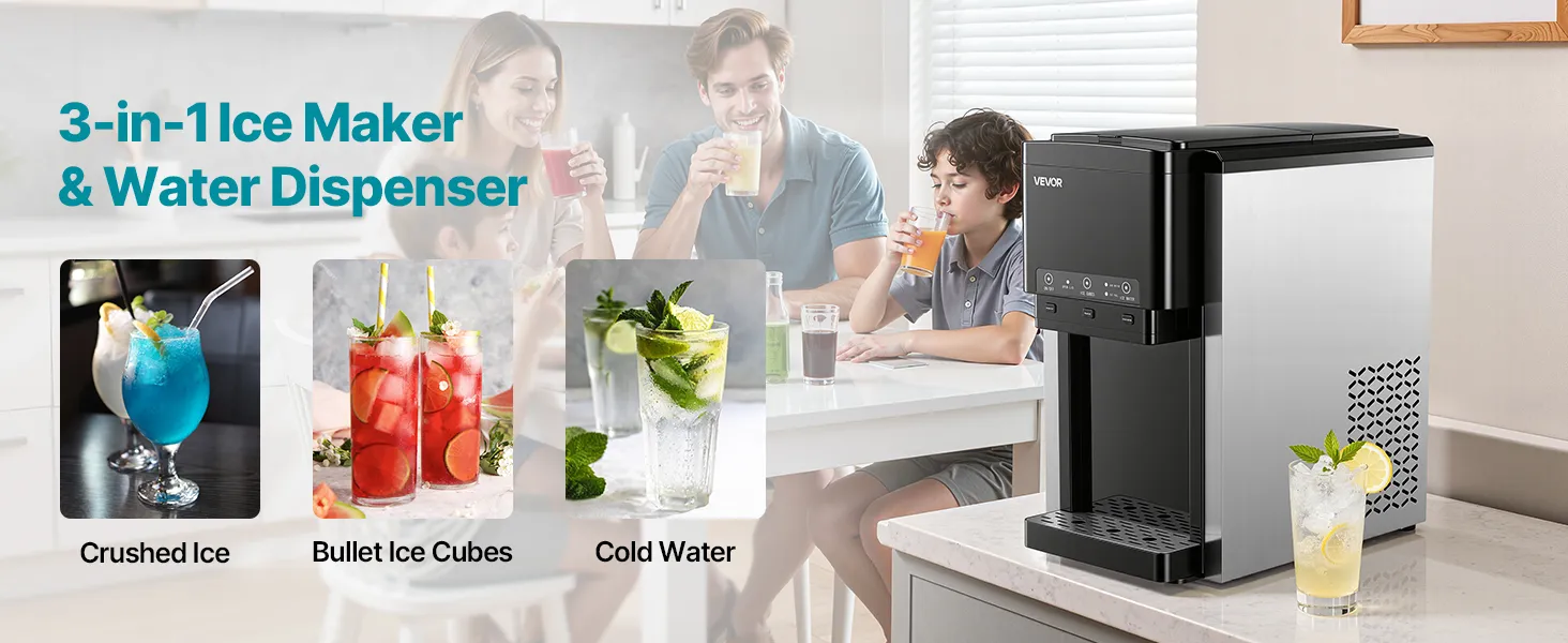 Tento 3 v 1 výrobník ľadu a dávkovač vody ľahko poskytuje kocky ľadu, drvený ľad a chladené nápoje. Vybavený intuitívnym ovládacím panelom, samočistením jedným tlačidlom a bezpečnostným krytom ponúka pohodlné ovládanie a spoľahlivú bezpečnosť, čo z neho robí ideálnu voľbu pre každodenné použitie.