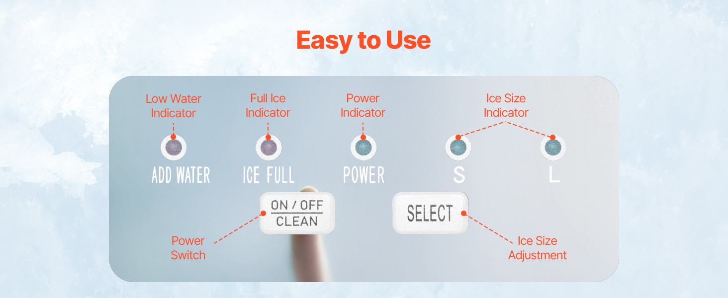 Vďaka jednoduchému ovládaniu pomocou tlačidiel a jasným kontrolkám sa stolný výrobník ľadu ľahko ovláda.
