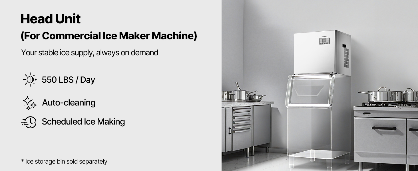 Hlavná jednotka a zásobník na ľad spolu tvoria kompletný komerčný výrobník ľadu. Ponúkame konfiguráciu zásobníka na ľad s hmotnosťou 300 libier / 136 kg, ktorý sa predáva samostatne.