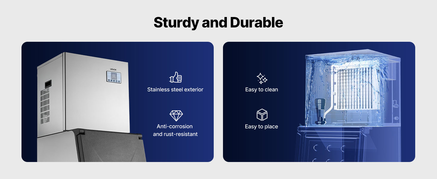 Zariadenie na výrobu ľadu pre komerčné účely má zdokonalený plášť z nehrdzavejúcej ocele, ktorý je odolný voči korózii a hrdzi, ľahko sa čistí a je vysoko odolný.