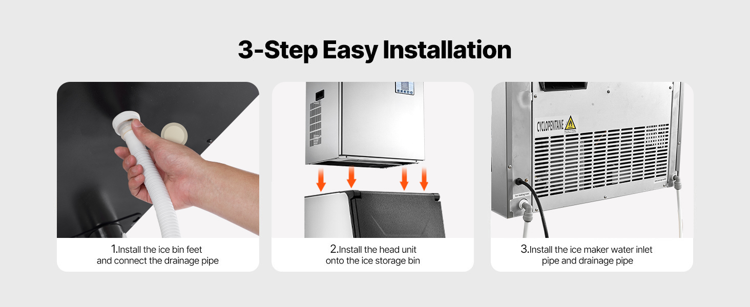 Výrobník ľadu sa ľahko inštaluje a gravitačná konštrukcia odtoku zabezpečuje rýchle a účinné vypúšťanie vody.