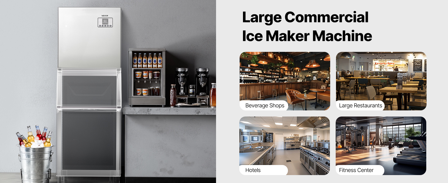 Výrobník kociek ľadu poskytuje veľký výkon ľadu, vďaka čomu je ideálny pre komerčné kuchyne, reštaurácie, bary, hotely a predajne nápojov.