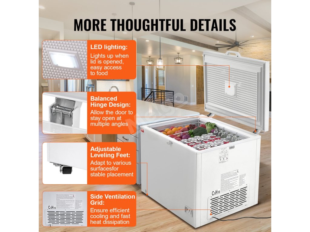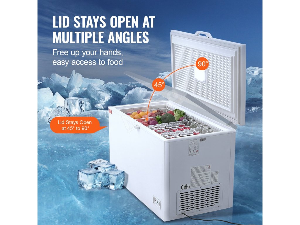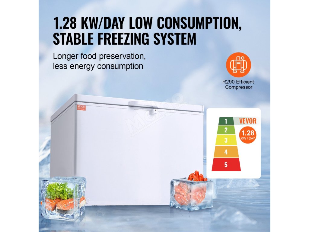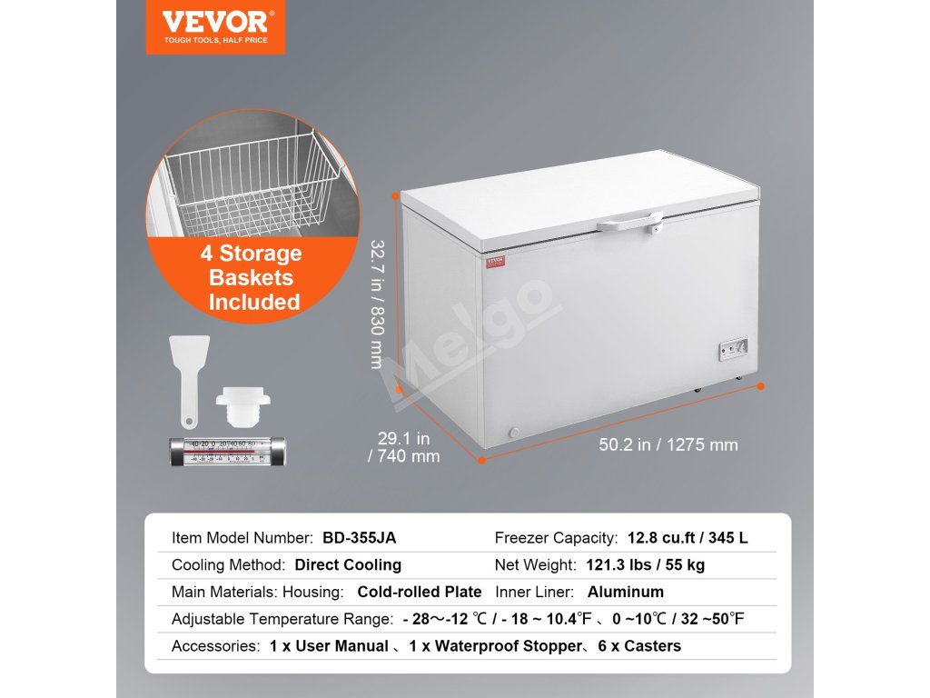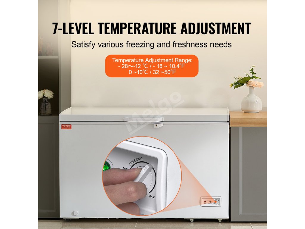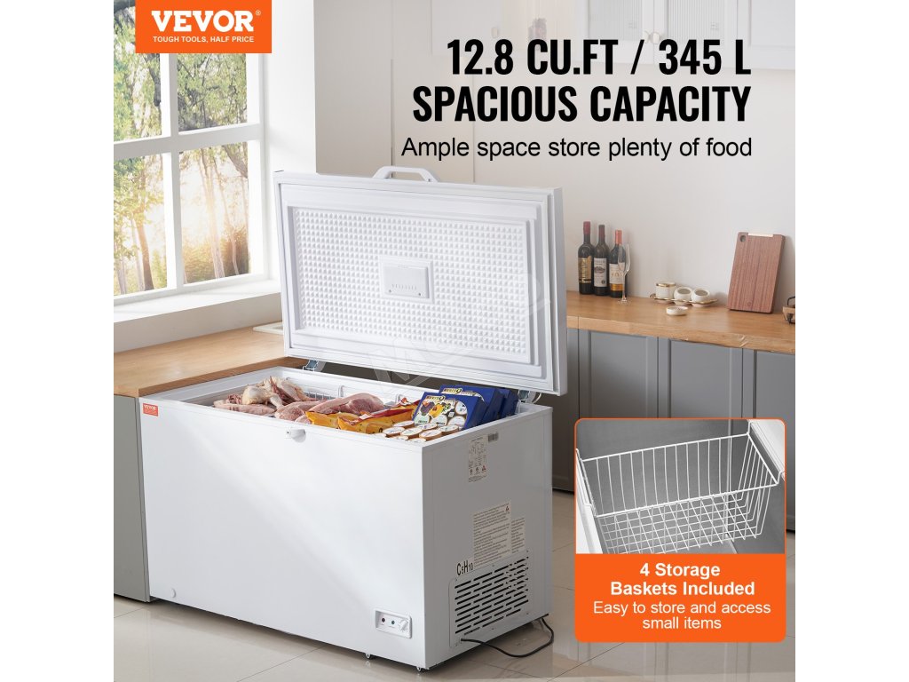Truhlicová mraznička VEVOR s veľkorysou kapacitou 12,8 cm3 a 4 vyberateľnými košmi je ideálna na skladovanie všetkého od moriakov až po pizzu a menšie predmety, vďaka čomu zostanú suroviny dlhšie čerstvé a chladné. Je navrhnutá so 7 teplotami na zmrazovanie rôznych položiek podľa vašich potrieb.