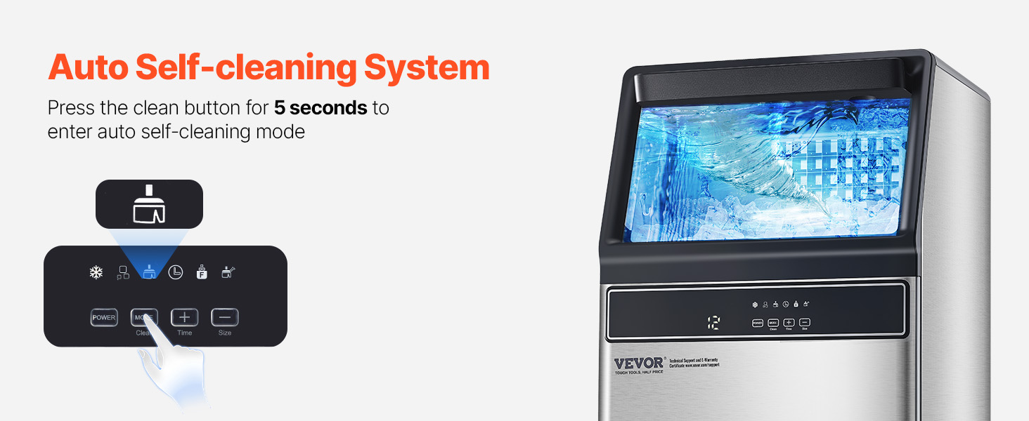 Náš výrobník ľadu má funkciu automatického samočistenia, ktorá zabezpečuje hygienické prostredie na výrobu ľadu a výrobu čistých kociek ľadu.
