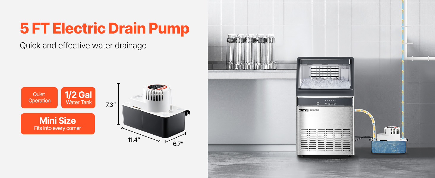 Komerčný výrobník ľadu je vybavený 5-fázovým elektrickým vypúšťacím čerpadlom, ktoré zabezpečuje rýchle a účinné vypúšťanie vody, aby sa zabránilo jej hromadeniu.