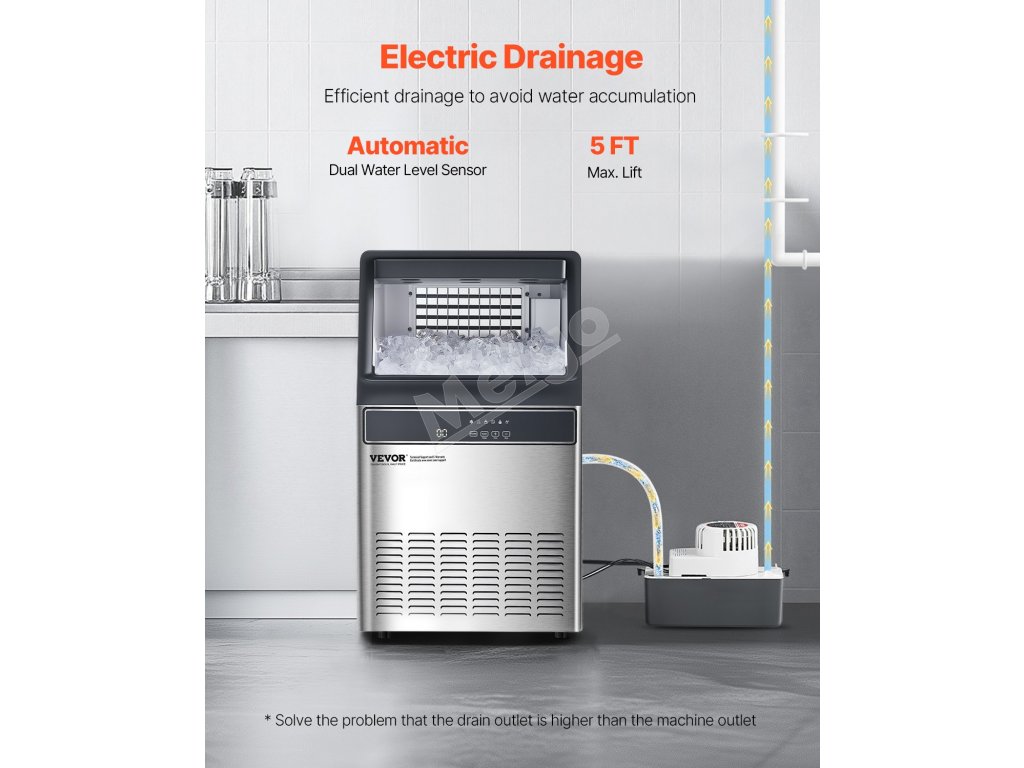 Komerčný výrobník ľadu je vybavený 5-fázovým elektrickým vypúšťacím čerpadlom, ktoré zabezpečuje rýchle a účinné vypúšťanie vody, aby sa zabránilo jej hromadeniu.