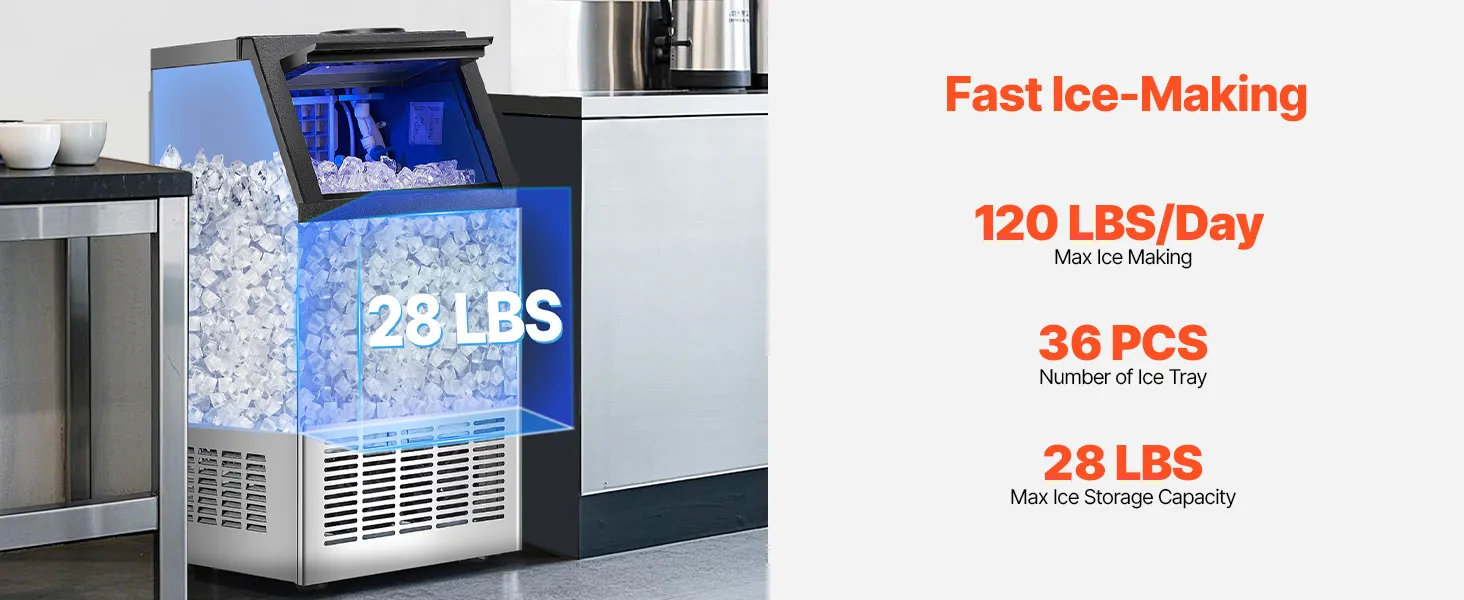 Výrobník ľadu 120lbs/24H, 36 kociek/15 min, 28lbs sklad, samočistenie