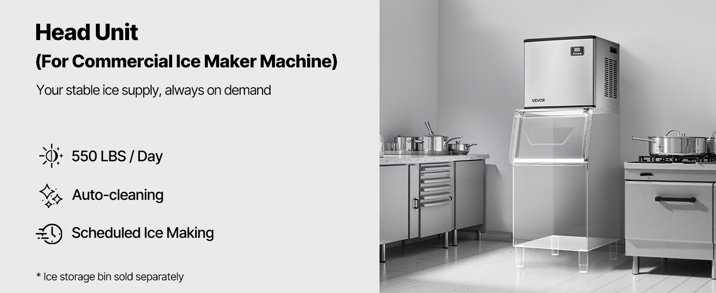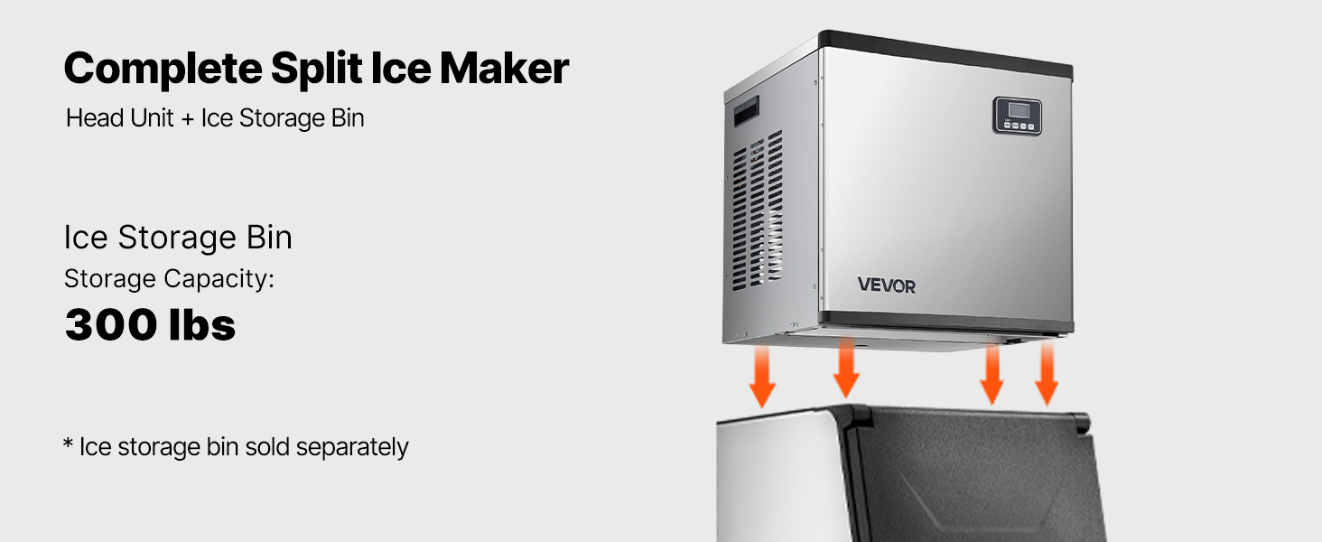 Hlavná jednotka a zásobník na ľad spolu tvoria kompletný komerčný výrobník ľadu. Ponúkame konfiguráciu zásobníka na ľad s hmotnosťou 300 libier / 136 kg, ktorý sa predáva samostatne.