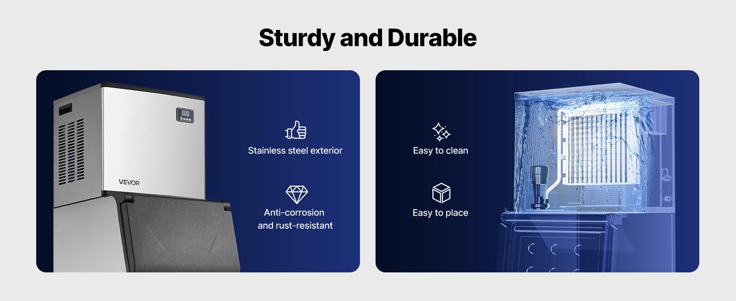 Zariadenie na výrobu ľadu pre komerčné účely má zdokonalený plášť z nehrdzavejúcej ocele, ktorý je odolný voči korózii a hrdzi, ľahko sa čistí a je vysoko odolný.