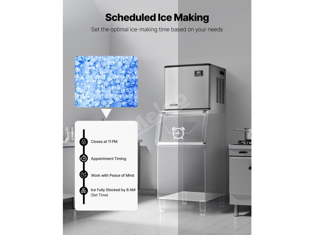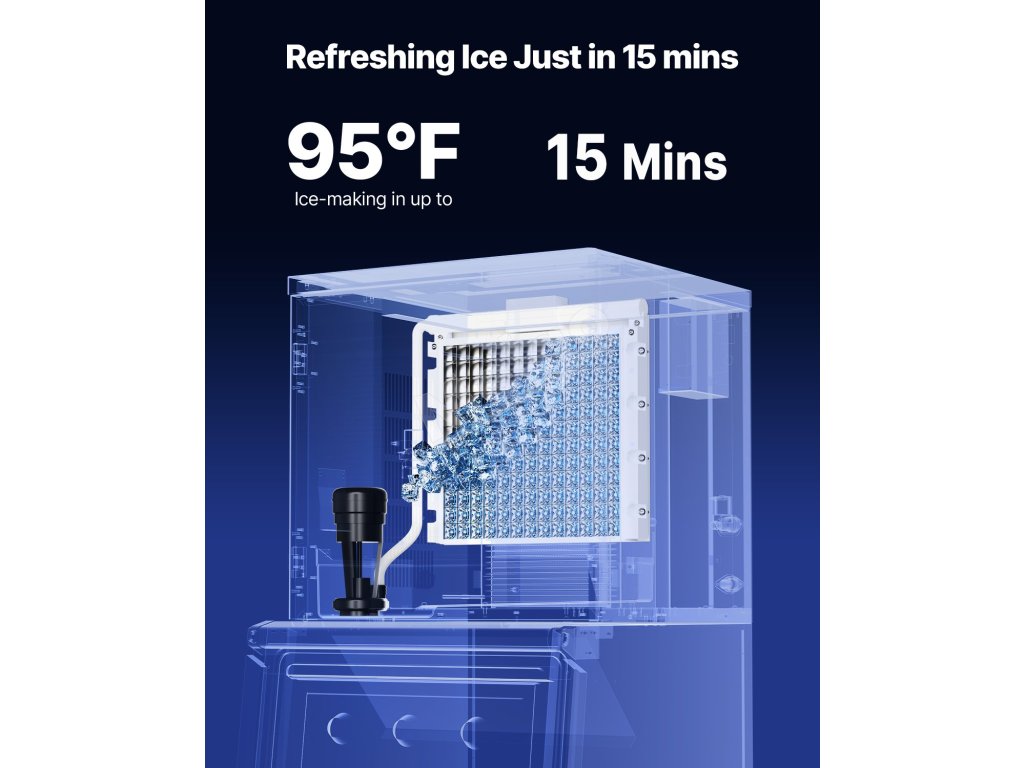 Komerčný výrobník ľadu je vybavený 160 zásobníkmi ľadu a dokáže vyrobiť 550 libier / 249,5 kg ľadu za 24 hodín, čím zabezpečuje nepretržitý prísun ľadu.