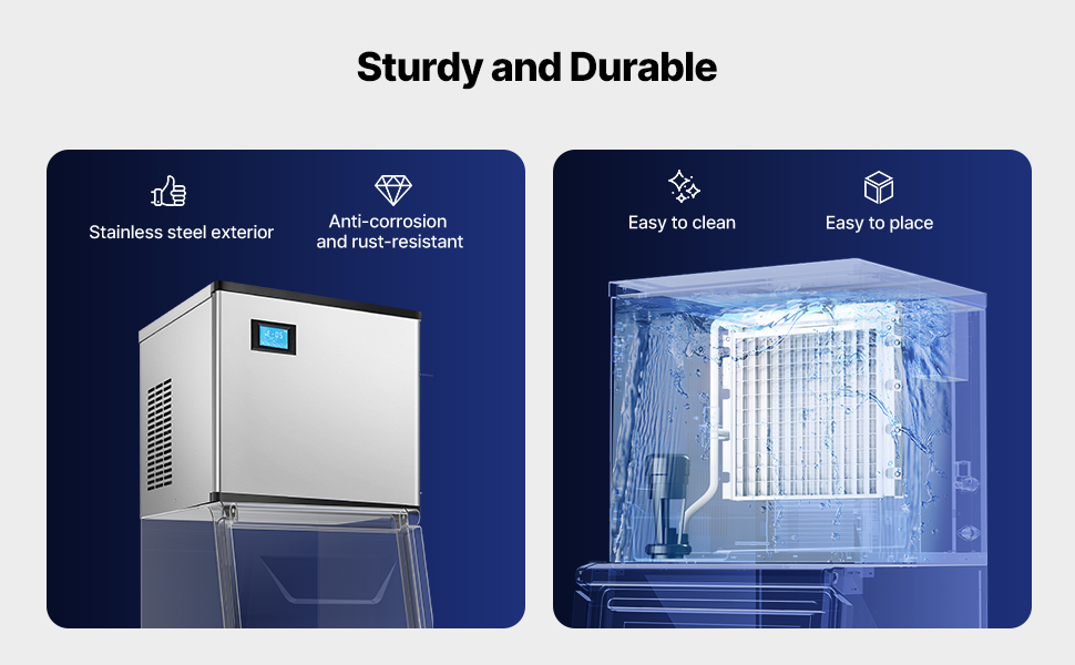 Komerčné výrobníky ľadu sa zvyčajne skladajú z dvoch hlavných častí: hlavnej jednotky na výrobu ľadu a zásobníka na ľad. Táto konštrukcia poskytuje zvýšenú flexibilitu a účinnosť, takže je ideálna pre podniky, domáce kuchyne alebo špecializované aplikácie.