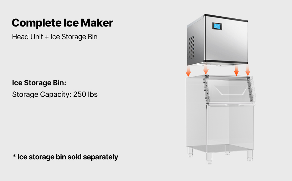 Hlavná jednotka a zásobník na ľad spolu tvoria kompletný komerčný výrobník ľadu. Ponúkame konfiguráciu zásobníka na ľad s hmotnosťou 250 libier, ktorý sa predáva samostatne.