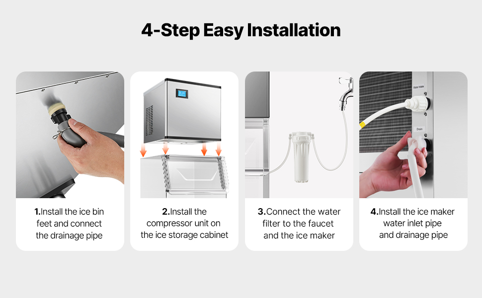 Výrobník ľadu sa ľahko inštaluje a gravitačná konštrukcia odtoku zabezpečuje rýchle a účinné vypúšťanie vody.