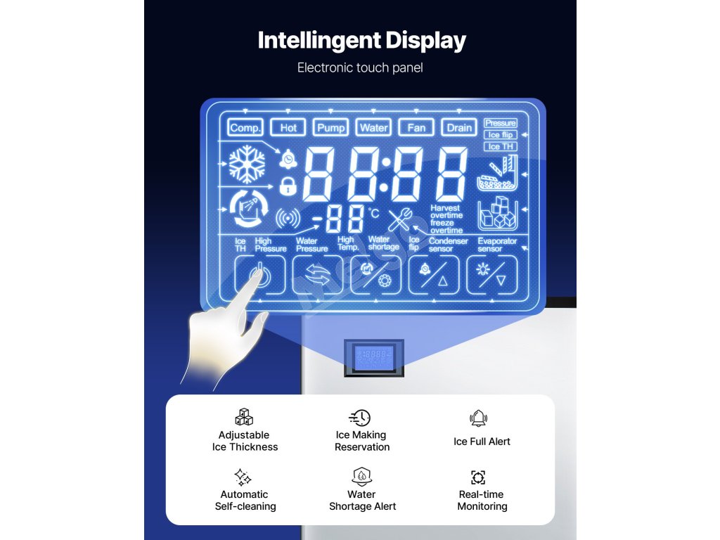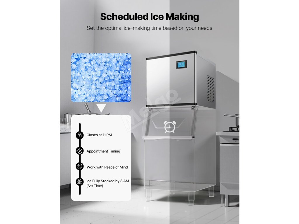 Výrobník kociek ľadu poskytuje veľký výkon ľadu, vďaka čomu je ideálny pre komerčné kuchyne, reštaurácie, bary, hotely a predajne nápojov.