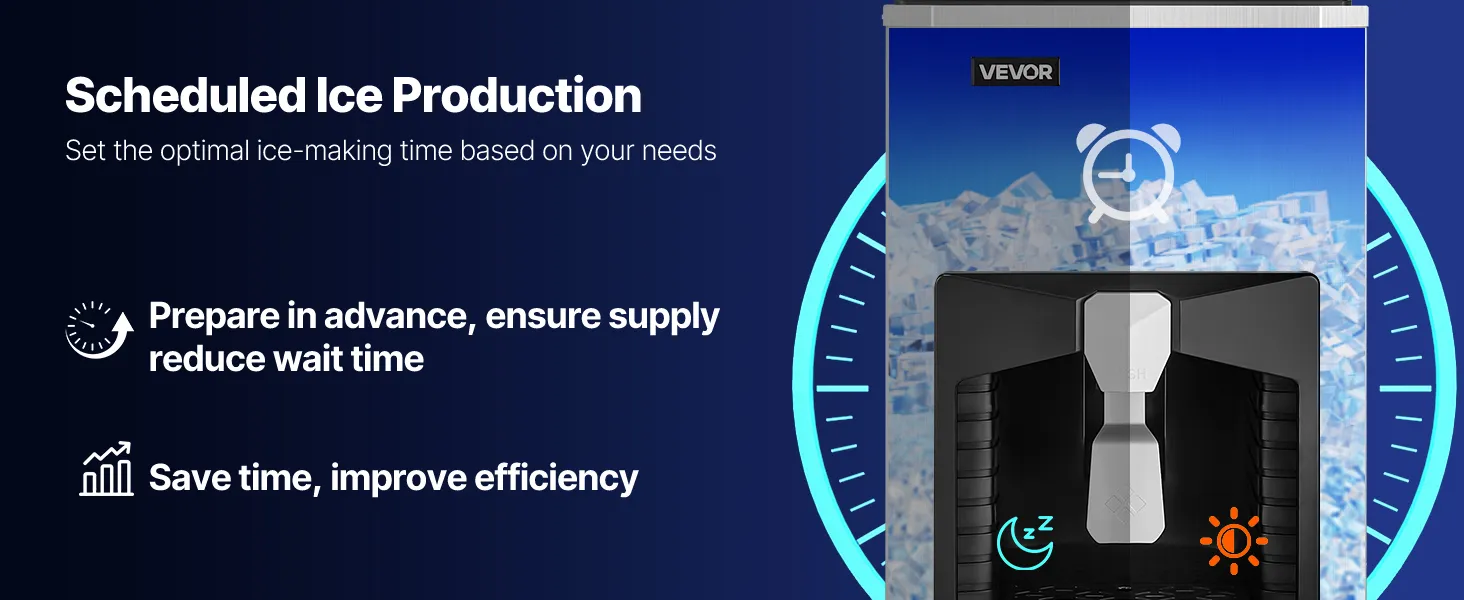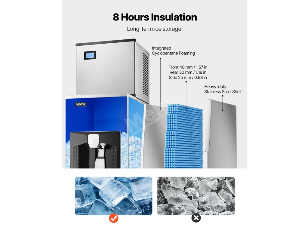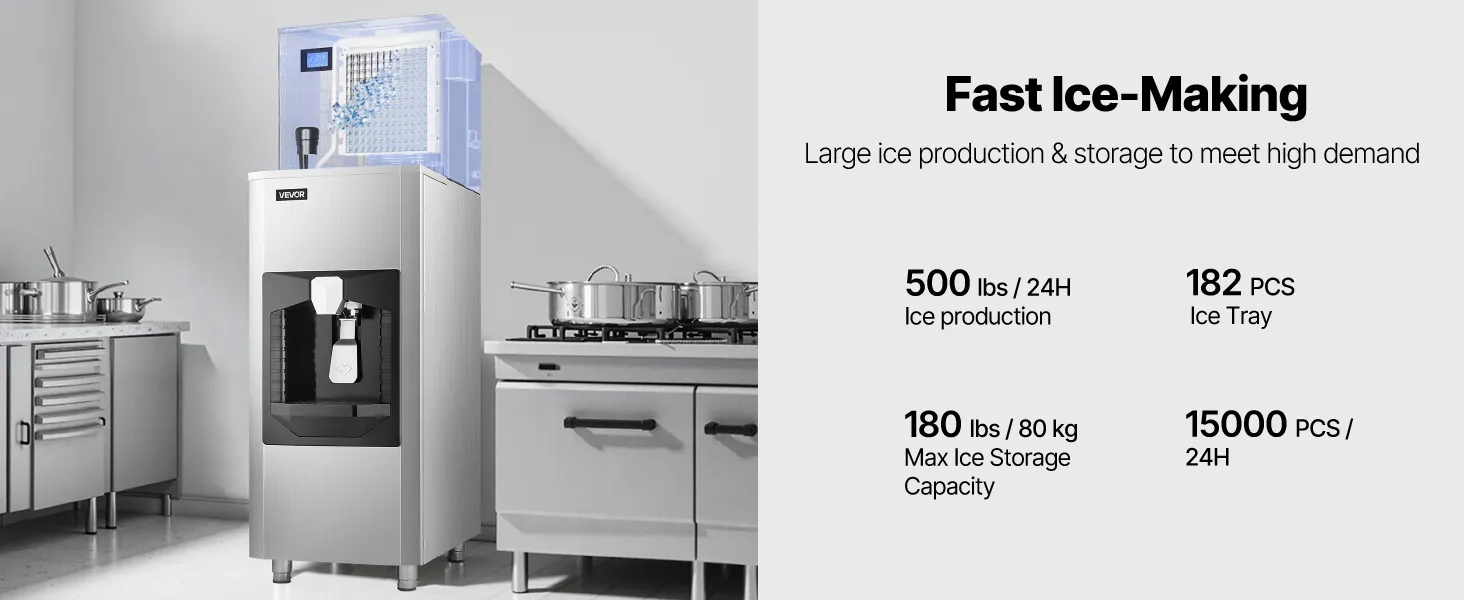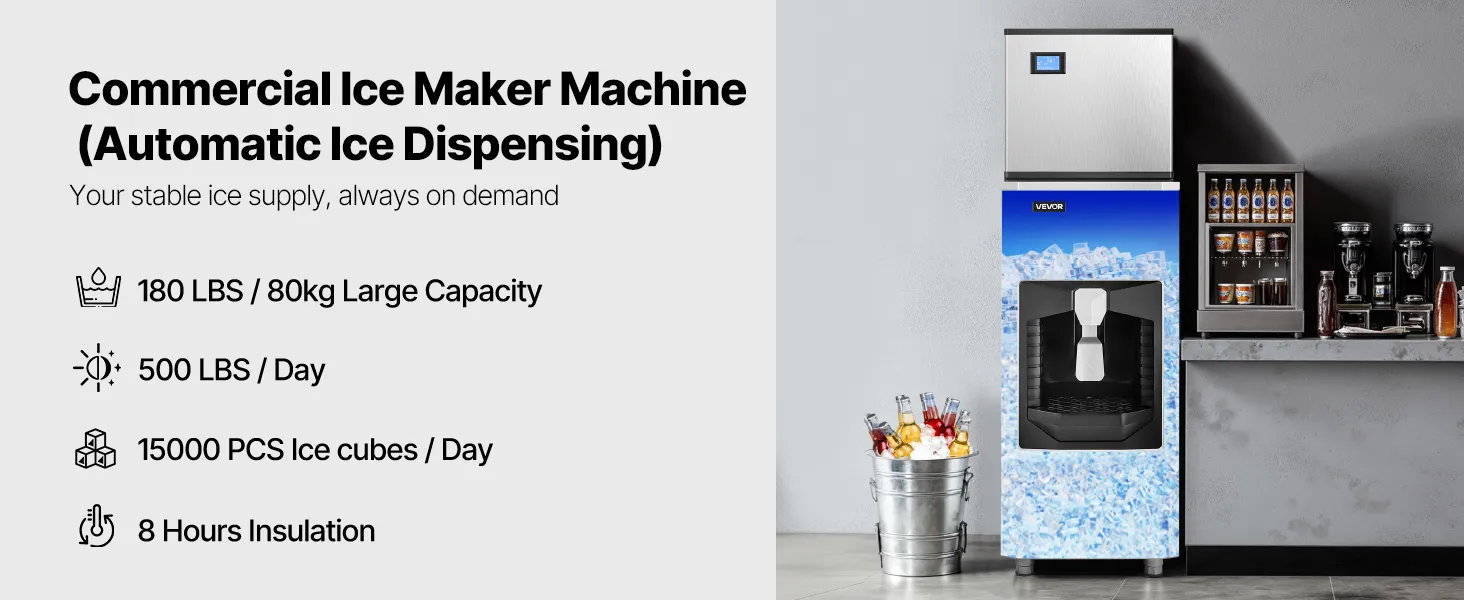 Chcete chladený a osviežujúci ľad? Komerčný výrobník ľadu VEVOR vyrobí 500 libier kociek ľadu každých 24 hodín. Môže sa pochváliť veľkou kapacitou 180 lbs a dlhším tepelnoizolačným účinkom, čo zaručuje nepretržitý prísun ľadu, ktorý je pripravený na podávanie.