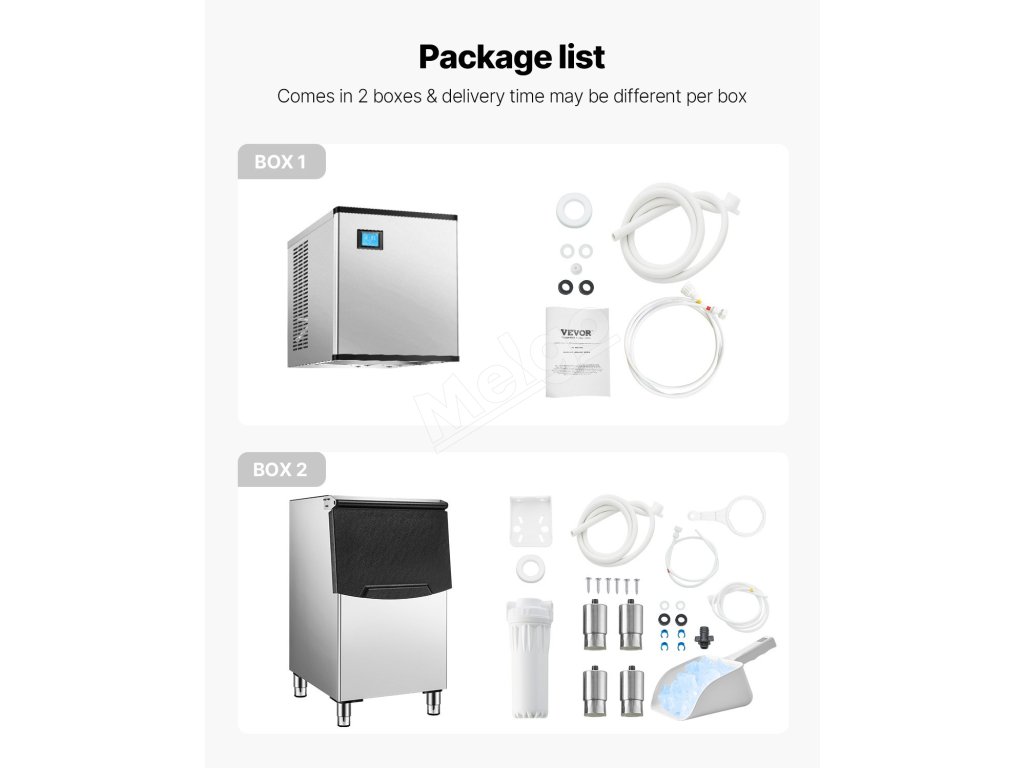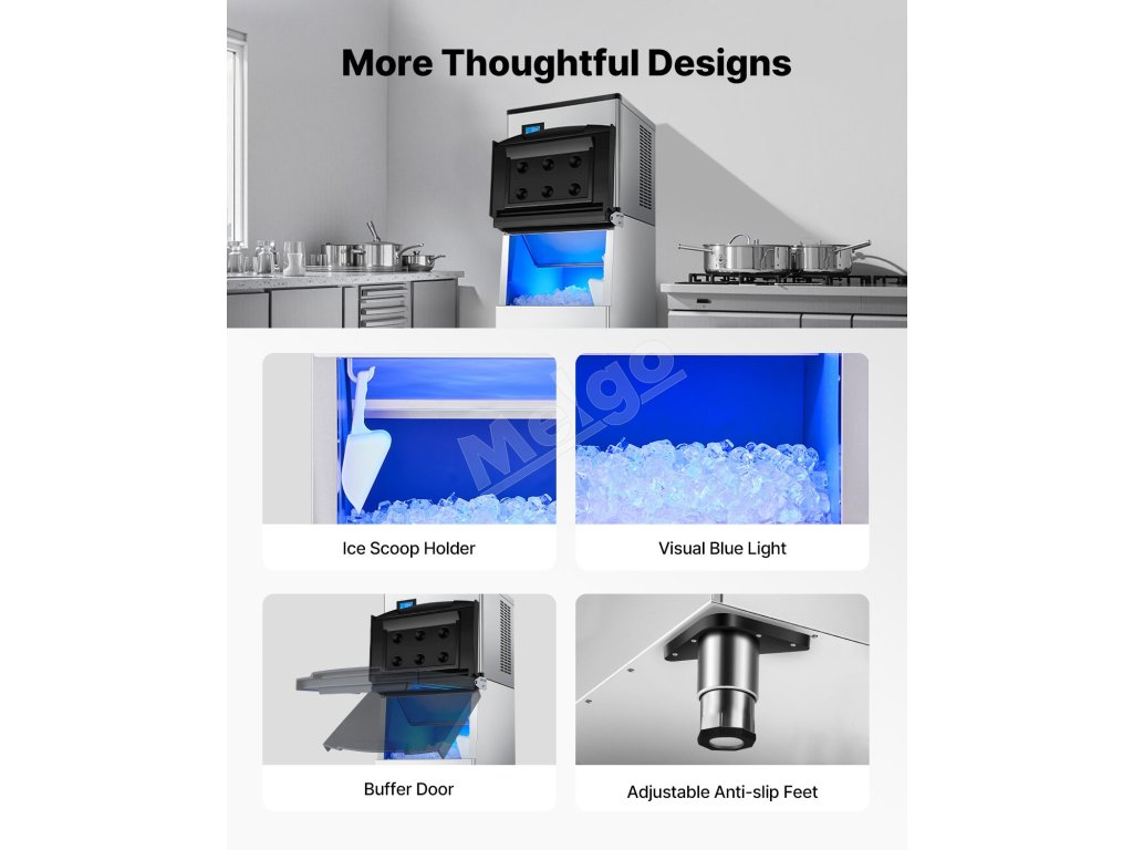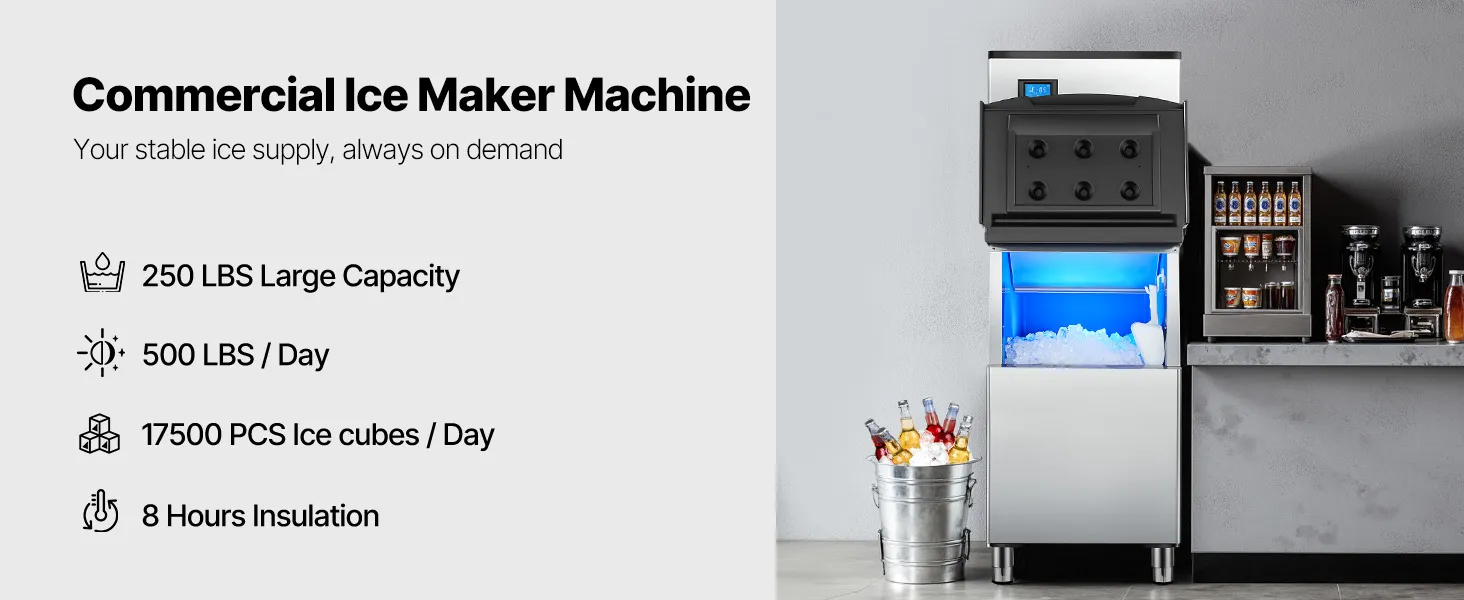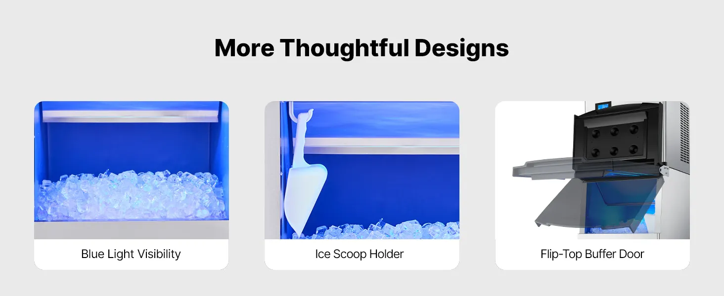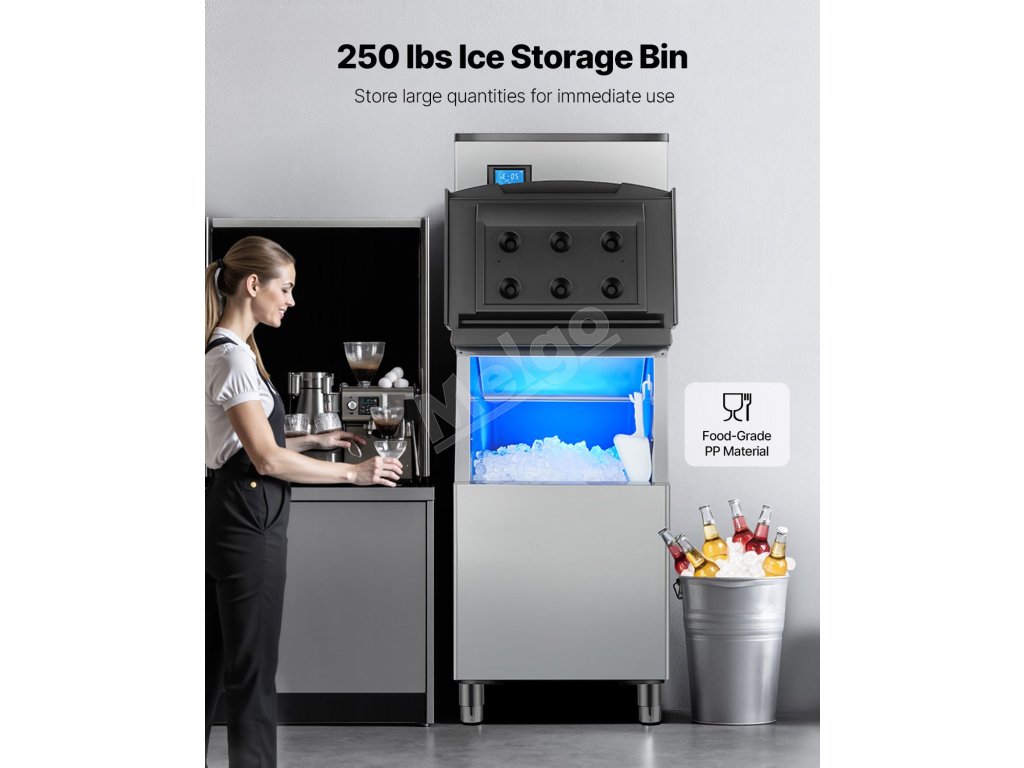 Komerčné výrobníky ľadu sa zvyčajne skladajú z dvoch hlavných častí: hlavnej jednotky na výrobu ľadu a zásobníka na ľad. Táto konštrukcia poskytuje zvýšenú flexibilitu a účinnosť, takže je ideálna pre podniky, domáce kuchyne alebo špecializované aplikácie.