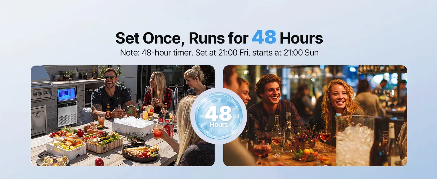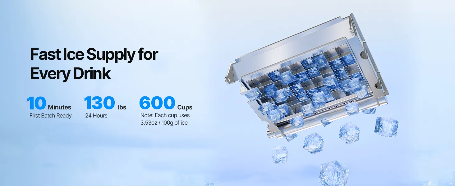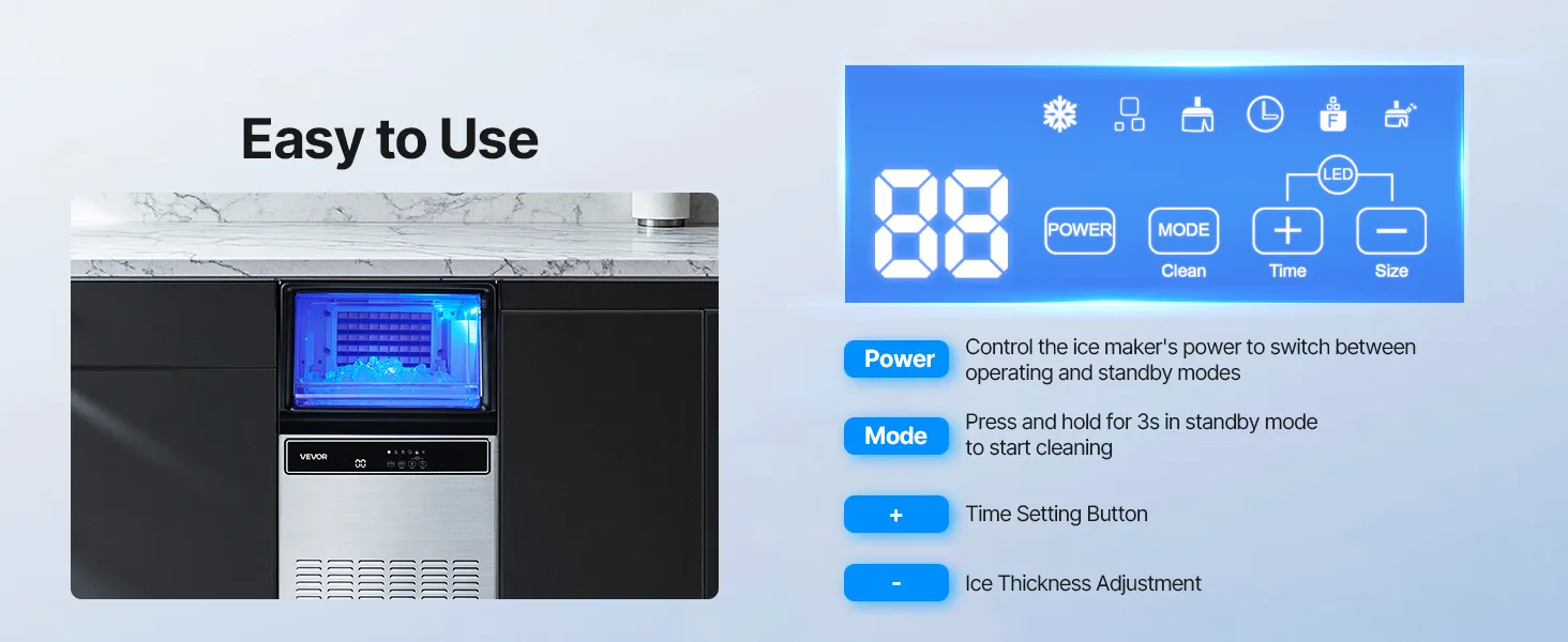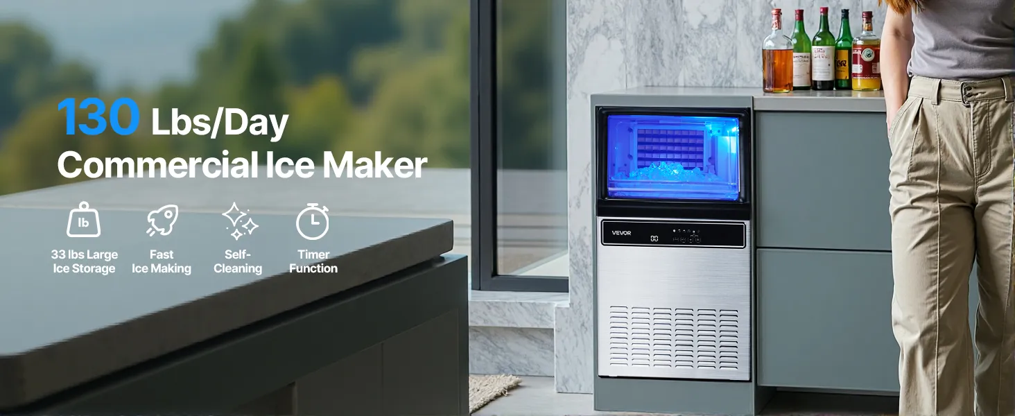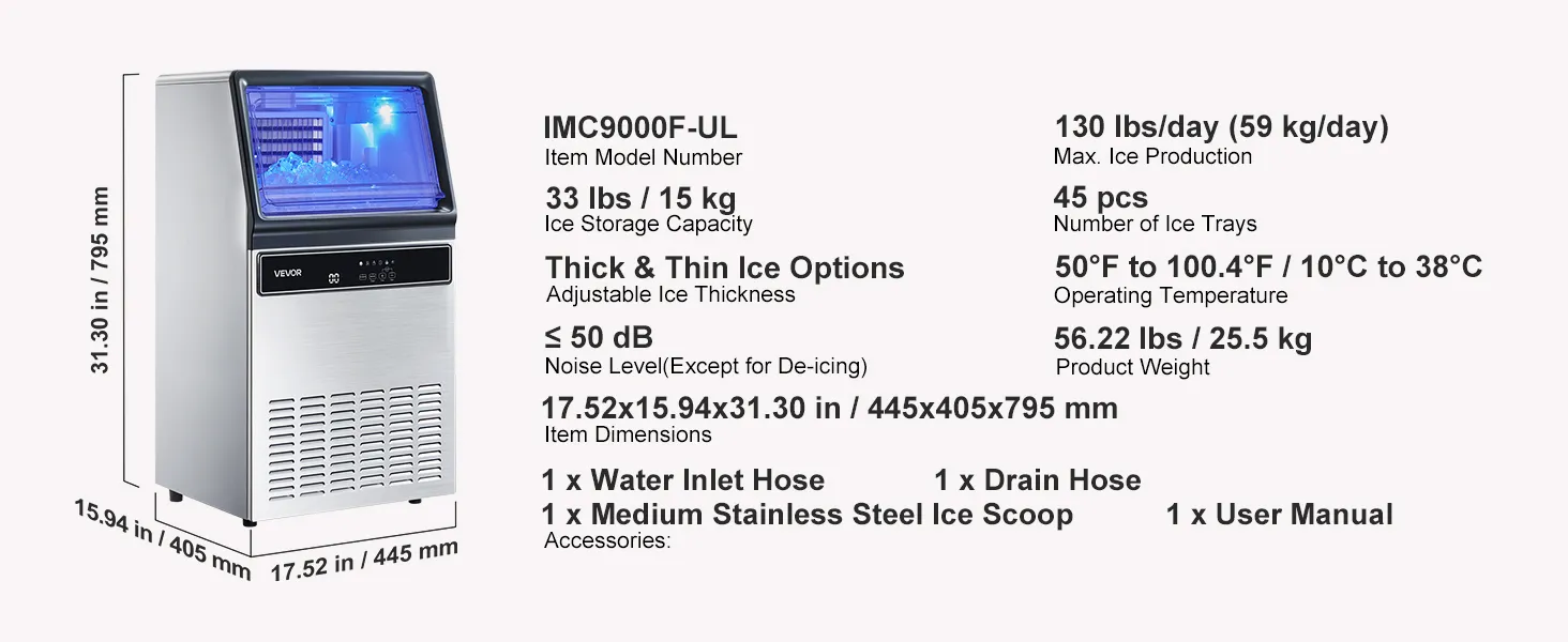 Komerčný stroj na výrobu ľadu vyrobí až 130 libier štvorcového ľadu za 24 hodín, pričom 33 libier je možné uskladniť. Vďaka certifikácii ENERGY STAR a ETL zaručuje bezpečný a energeticky efektívny výkon. Je vybavený funkciou automatického čistenia a časovačom pre jednoduché každodenné používanie, ideálny pre domáce použitie alebo ľahké komerčné potreby.