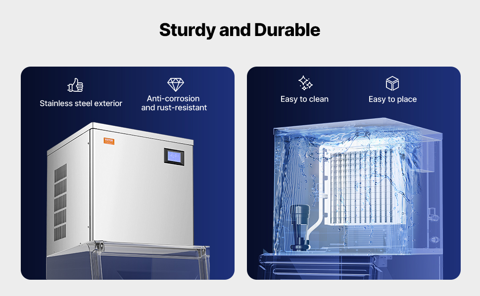 Zariadenie na výrobu ľadu pre komerčné účely má zdokonalený plášť z nehrdzavejúcej ocele, ktorý je odolný voči korózii a hrdzi, ľahko sa čistí a je vysoko odolný.