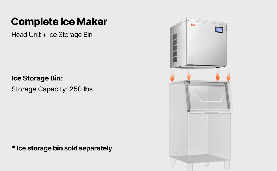Hlavná jednotka a zásobník na ľad spolu tvoria kompletný komerčný výrobník ľadu. Ponúkame konfiguráciu zásobníka na ľad s hmotnosťou 250 libier, ktorý sa predáva samostatne.