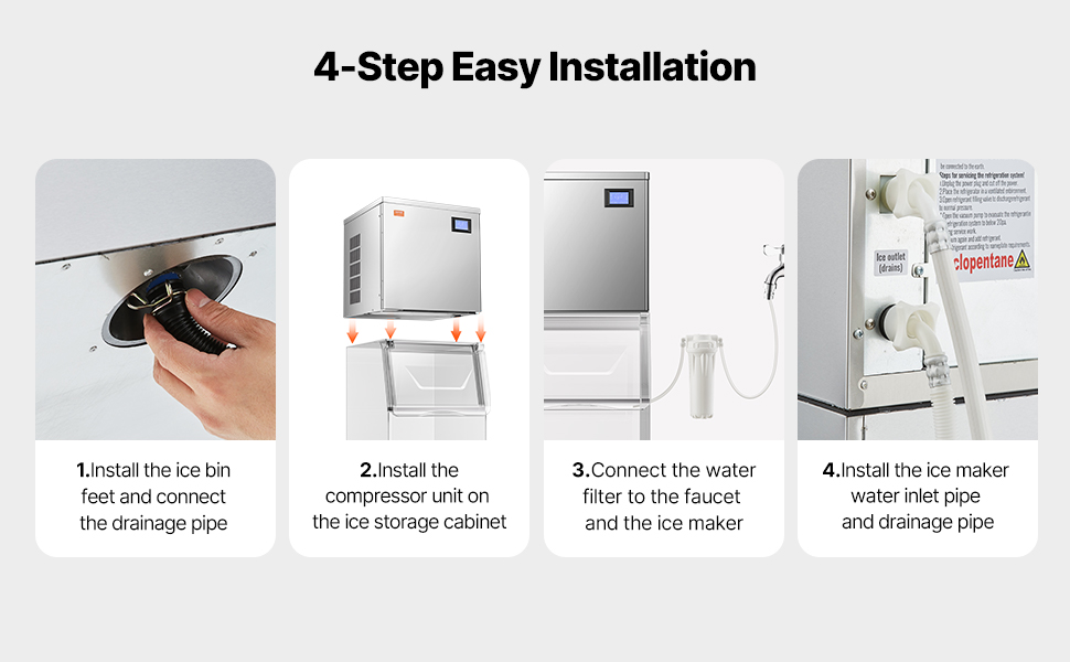 Výrobník ľadu sa ľahko inštaluje a gravitačná konštrukcia odtoku zabezpečuje rýchle a účinné vypúšťanie vody.