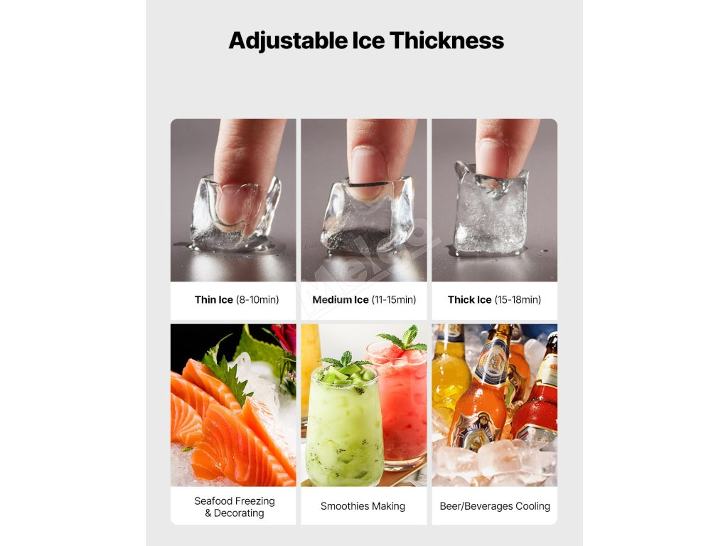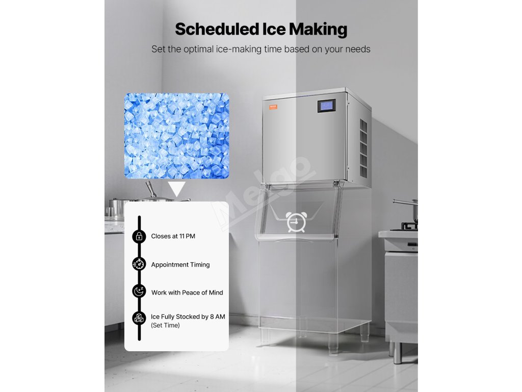 Výrobník kociek ľadu poskytuje veľký výkon ľadu, vďaka čomu je ideálny pre komerčné kuchyne, reštaurácie, bary, hotely a predajne nápojov.
