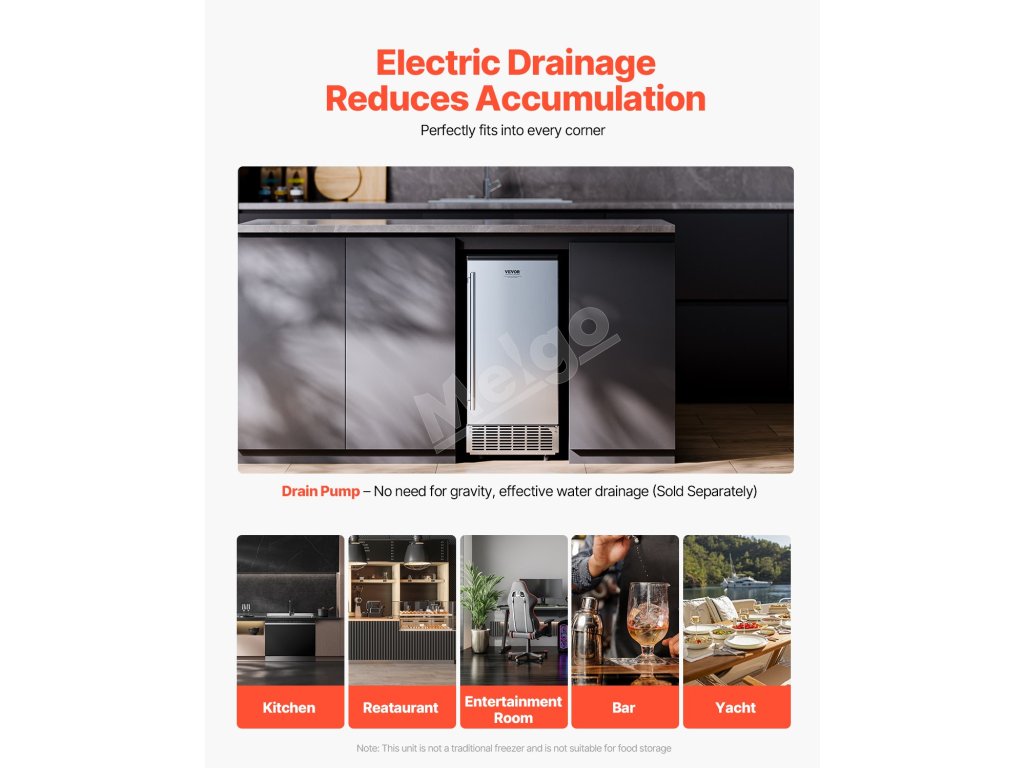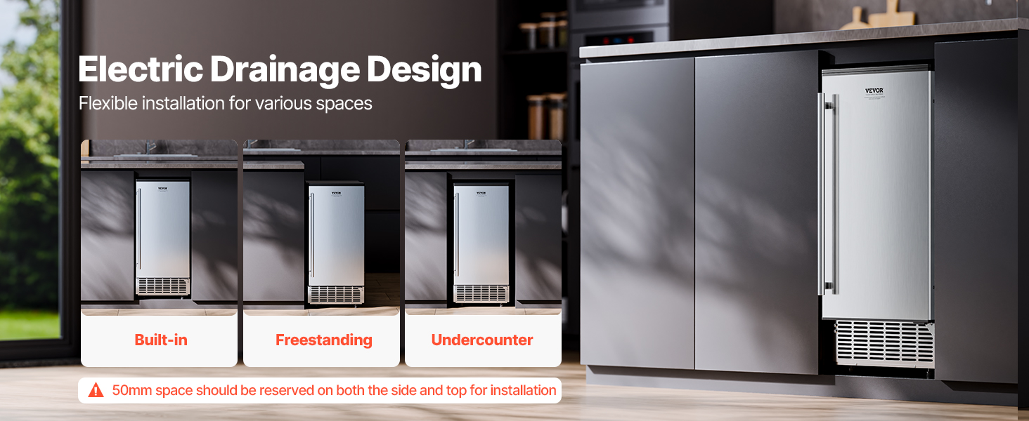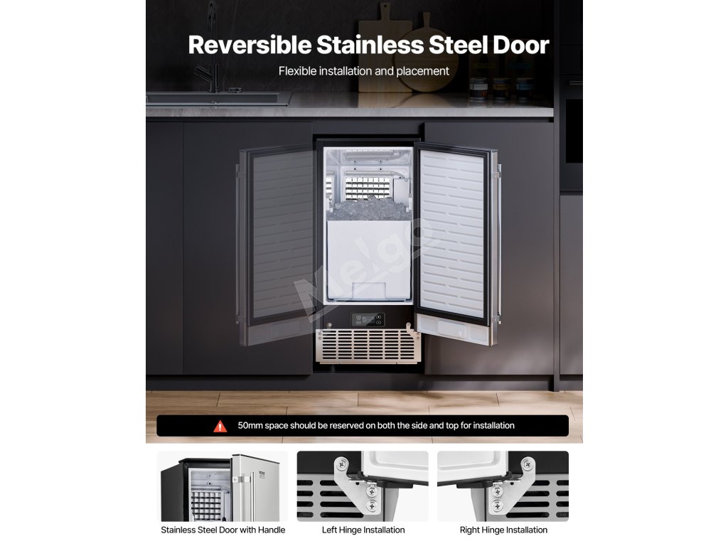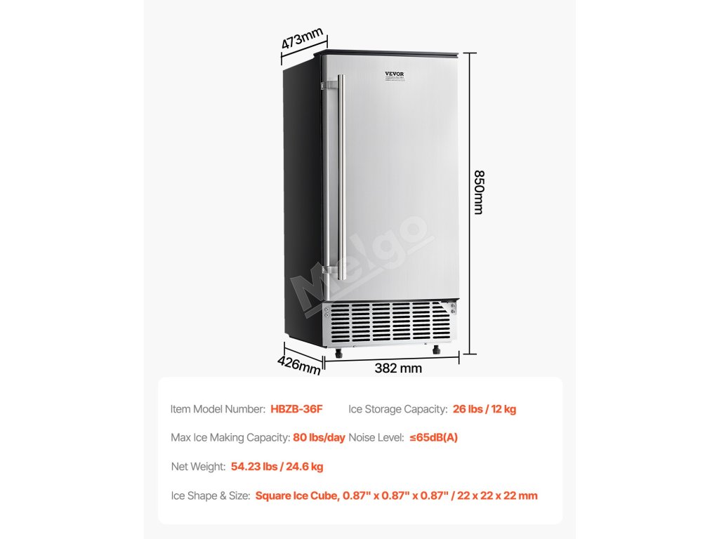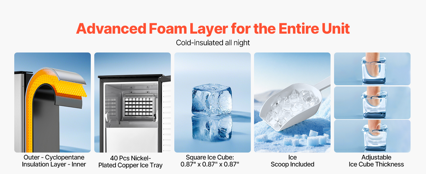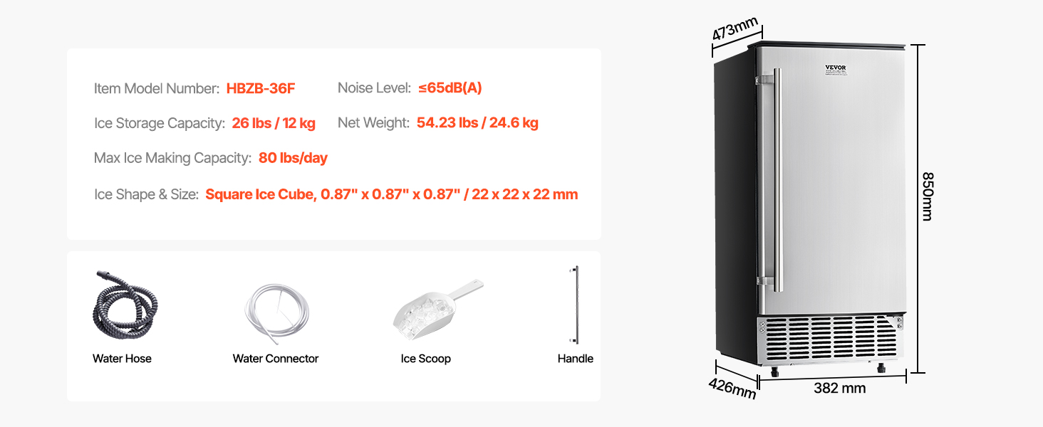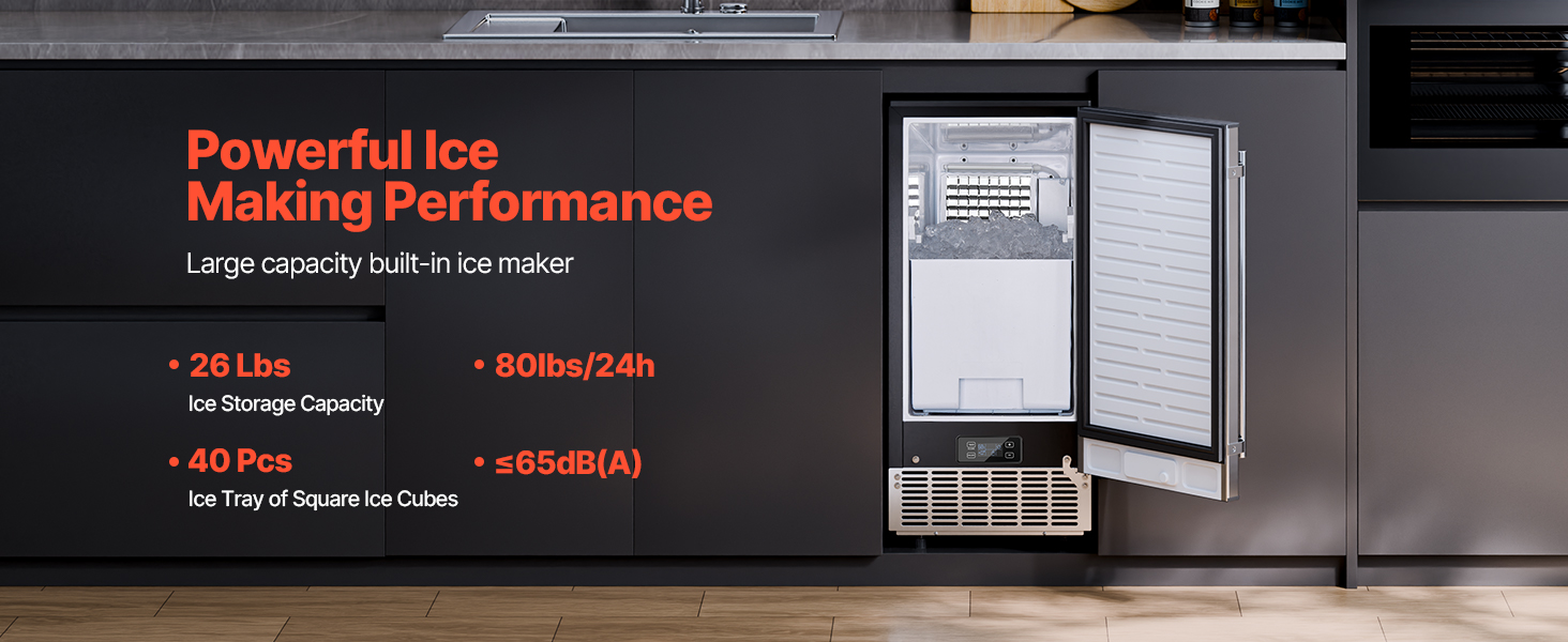 Tento výkonný vstavaný výrobník ľadu pod stôl dokáže vyrobiť 80 libier štvorcových kociek ľadu (0,87 × 0,87 × 0,87 palca) za deň, pričom ľad je pripravený už za 15 minút. Kôš na ľad má kapacitu 26 lbs, čo zaručuje stabilné zásobovanie, ktoré uspokojí vaše potreby ľadu.