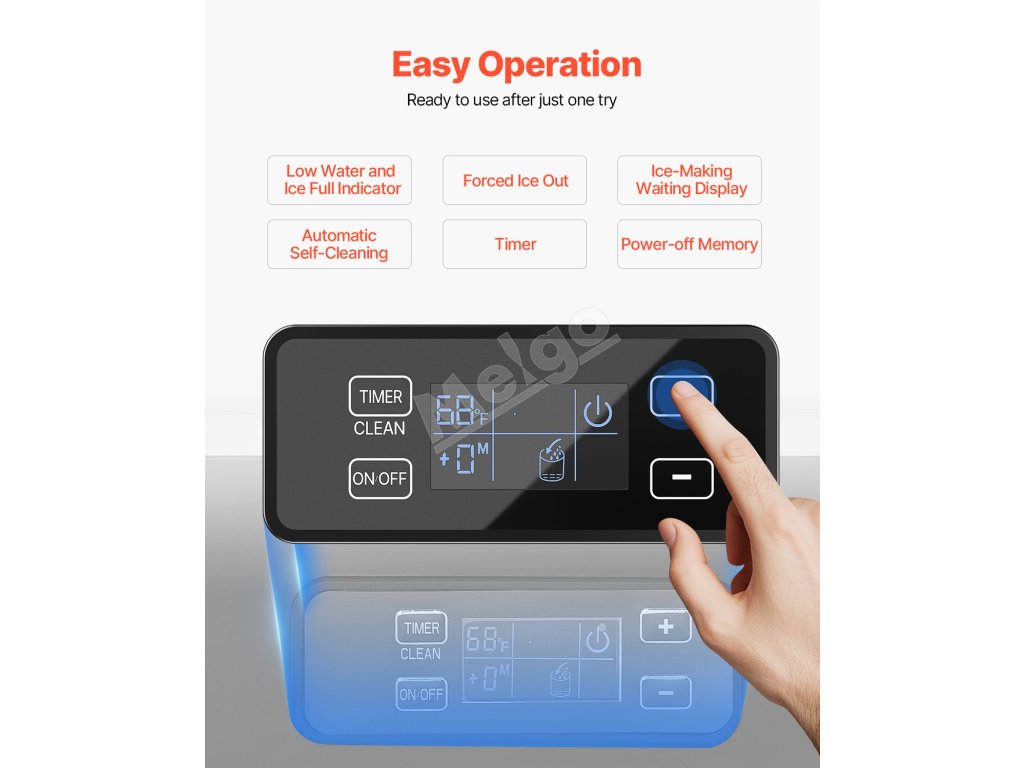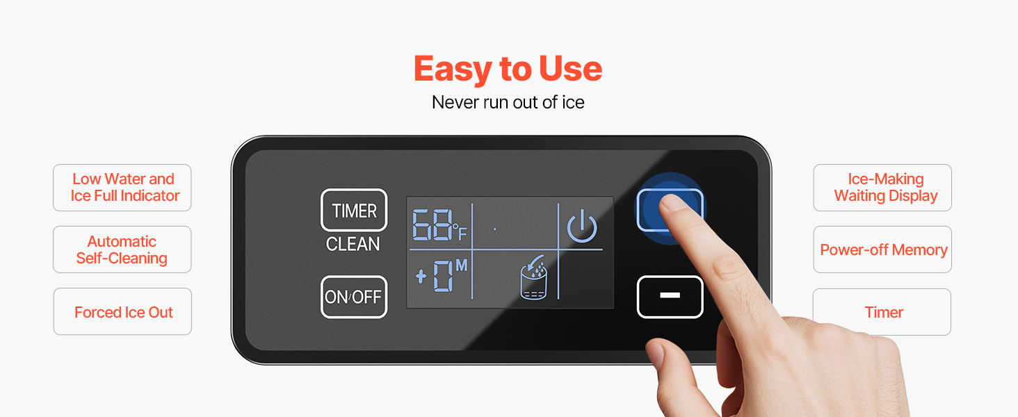 Tento stroj na výrobu ľadu, ktorý je vybavený upozorneniami na nedostatok vody a plný ľad, núteným vypúšťaním ľadu, automatickým samočistením, časovačom, displejom čakajúcim na výrobu ľadu a pamäťovými funkciami vypnutia, poskytuje profesionálnejší zážitok z výroby ľadu.