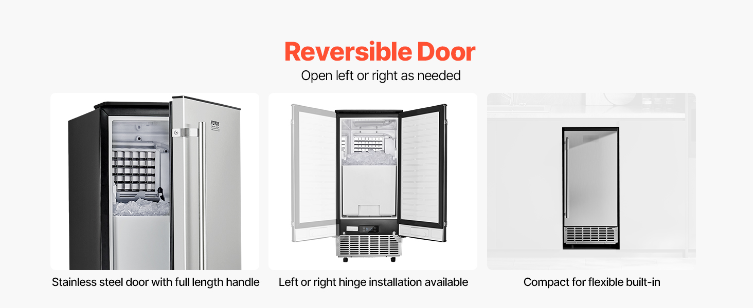 Vďaka obojstranným dvierkam z nehrdzavejúcej ocele a rukoväti po celej dĺžke sa zabudovaný výrobník ľadu môže otvárať zľava alebo sprava. Inštalácia tohto zabudovaného výrobníka ľadu zvýši komfort a pohodlie v každom priestore.