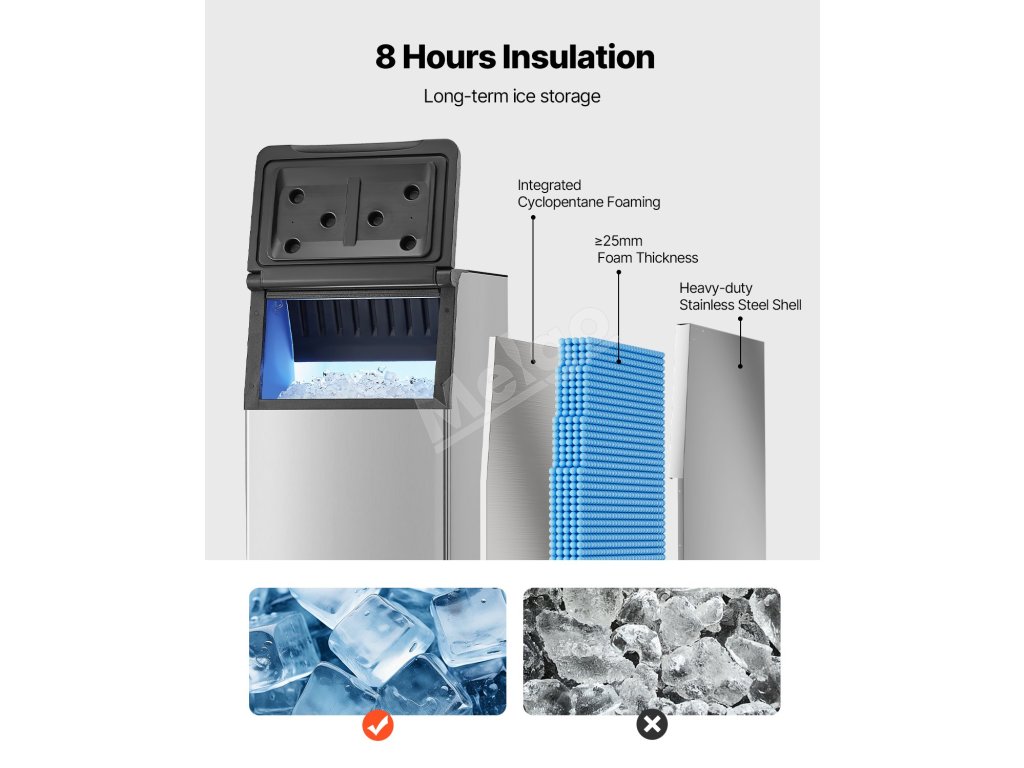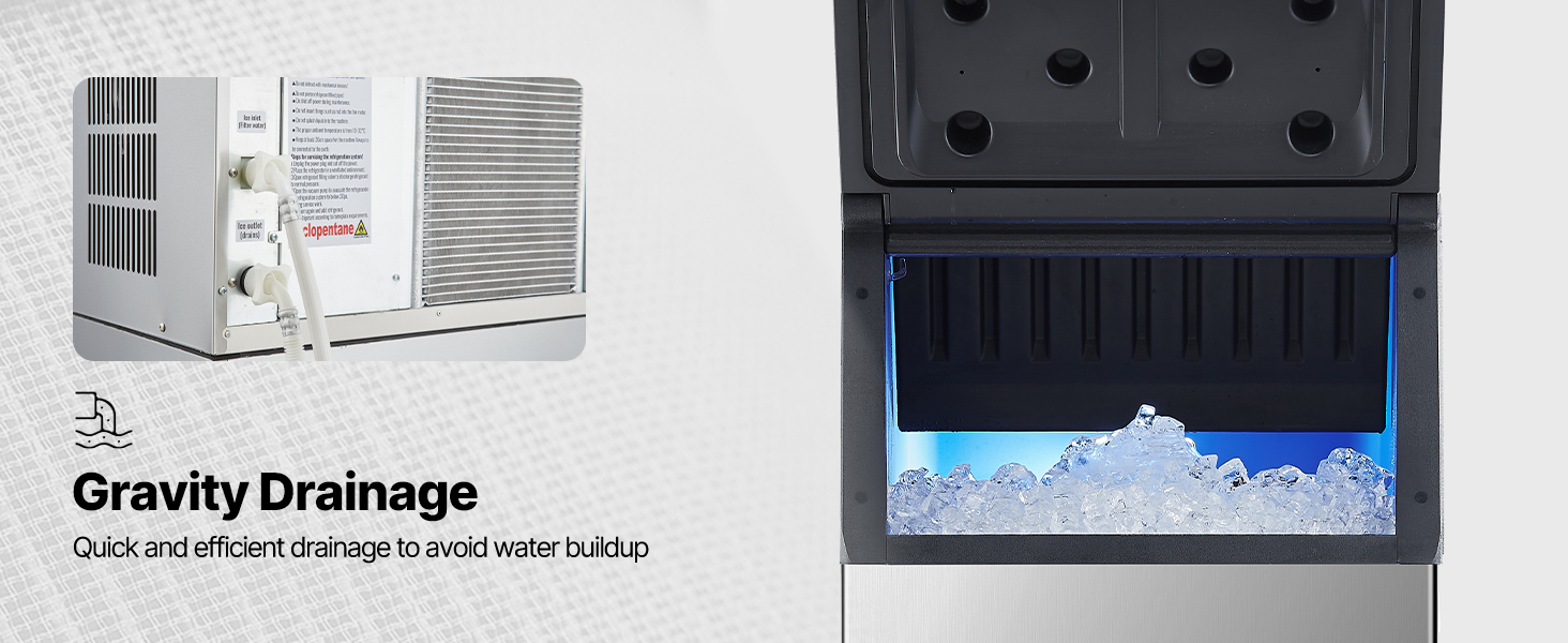 Zásobník na ľad je vybavený funkciou automatického vypúšťania, ktorá zabezpečuje účinné vypúšťanie vody, zabraňuje jej hromadeniu a zaisťuje čisté a zdravé prostredie na výrobu ľadu.