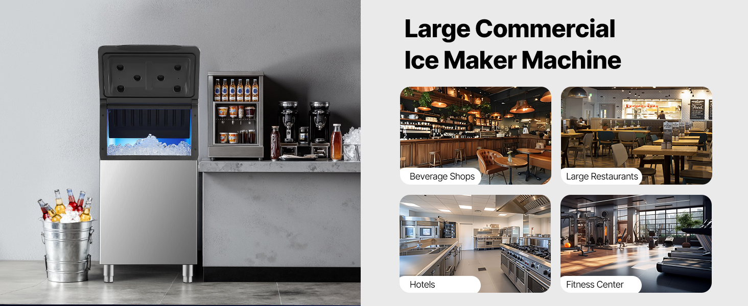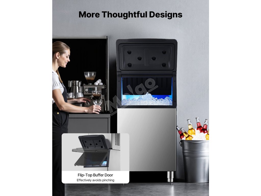Výrobník kociek ľadu poskytuje veľký výkon ľadu, vďaka čomu je ideálny pre komerčné kuchyne, reštaurácie, bary, hotely a predajne nápojov.