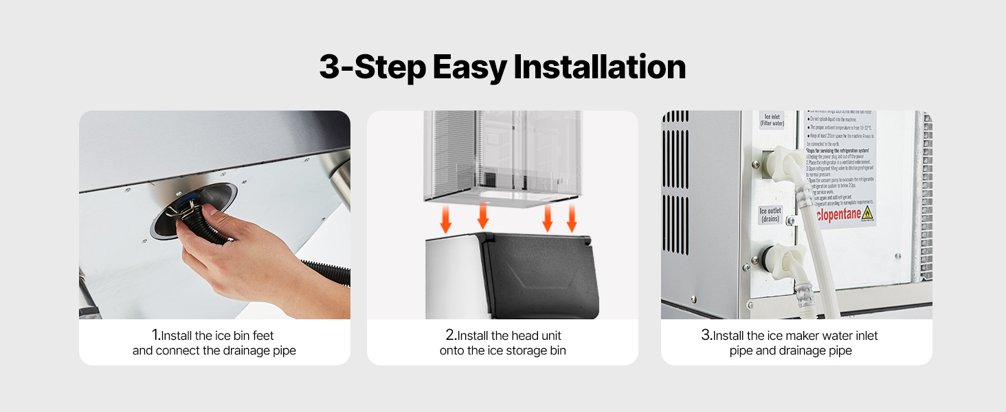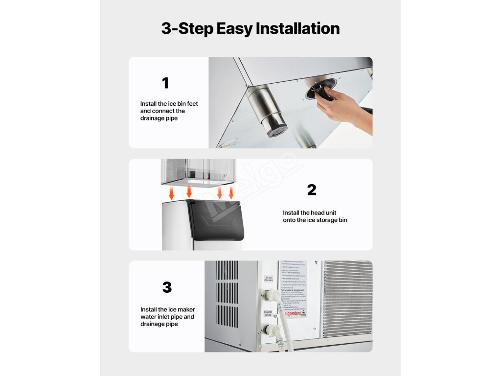 Komerčný zásobník na ľad sa ľahko inštaluje v 4 jednoduchých krokoch. Rýchlo nastavte výrobník ľadu a začnite vyrábať ľad.