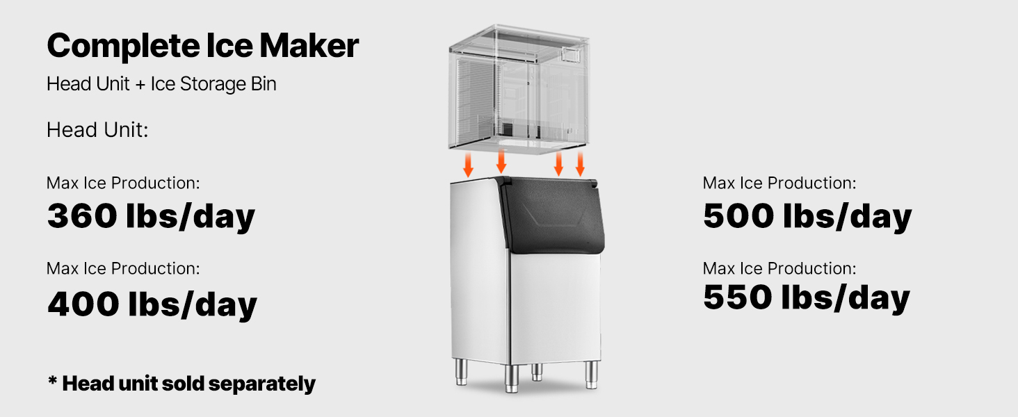Hlavná jednotka a zásobník na ľad spolu tvoria kompletný komerčný výrobník ľadu. Ponúkame hlavné jednotky s rôznym výkonom výroby ľadu, ktoré je potrebné zakúpiť samostatne.