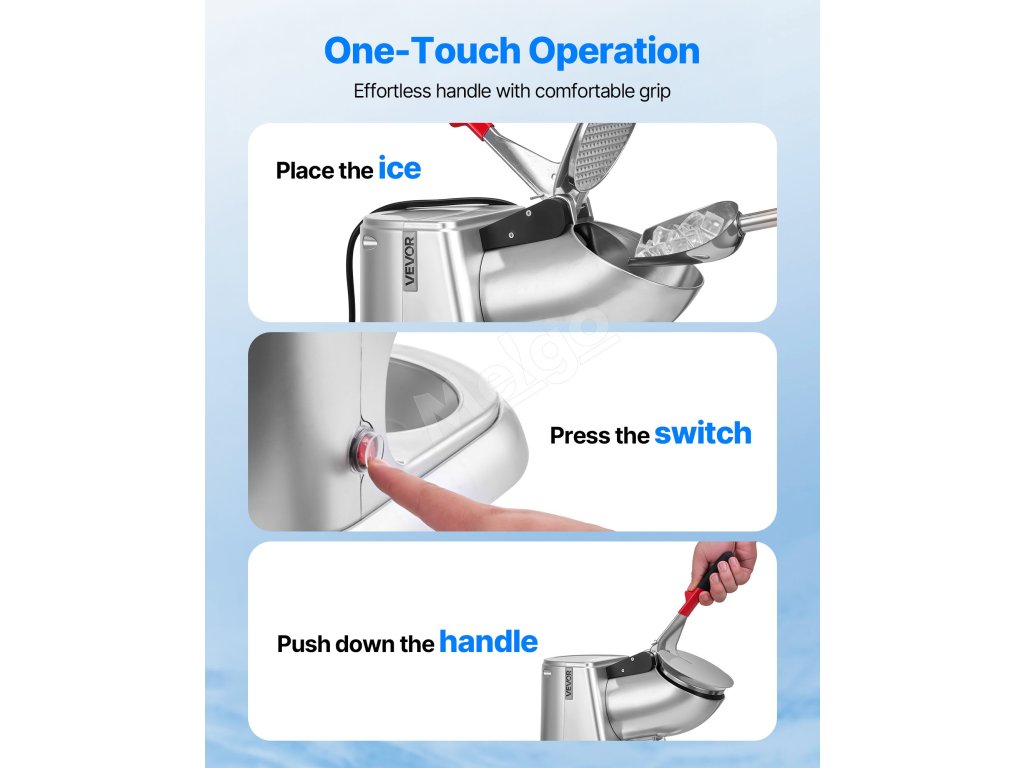 Drvič ľadu rozdrví až 220 kg ľadu za hodinu a je vybavený veľkou nádobou na ľad na jednoduchý zber. Od domácich osláv až po komerčné predajne nápojov si môžete vychutnať okamžité ľadové osvieženie stlačením jediného tlačidla.