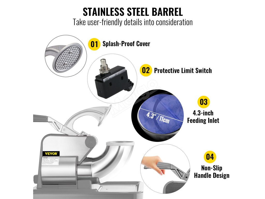 Zväčšený vstupný otvor na podávanie eliminuje potrebu opakovaného dopĺňania a mriežkovo navrhnutá tlačná doska dokáže zabrániť rozstrekovaniu ľadu. Súčasťou dodávky je koncový spínač.