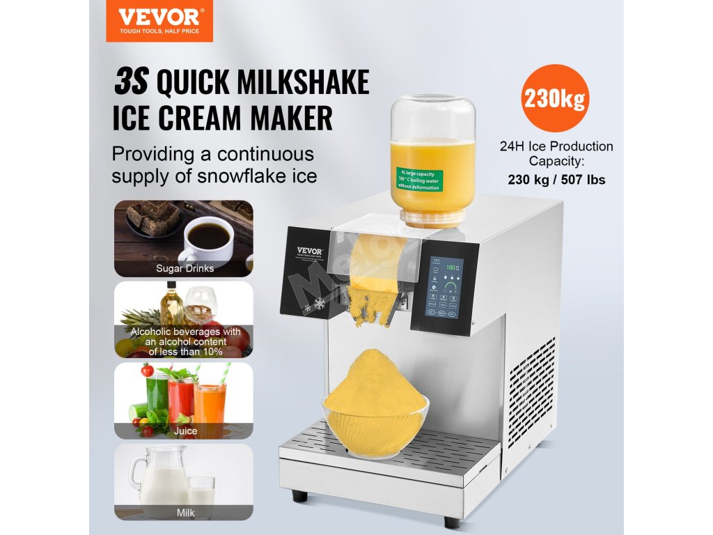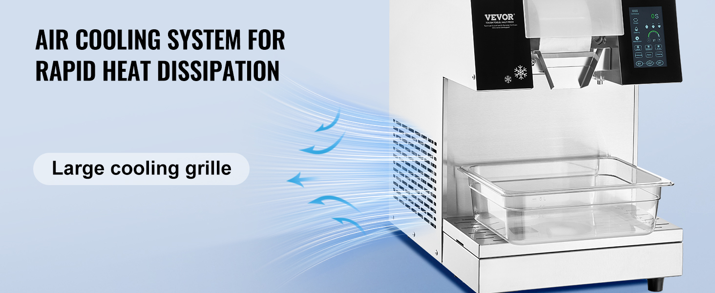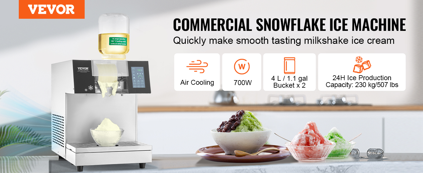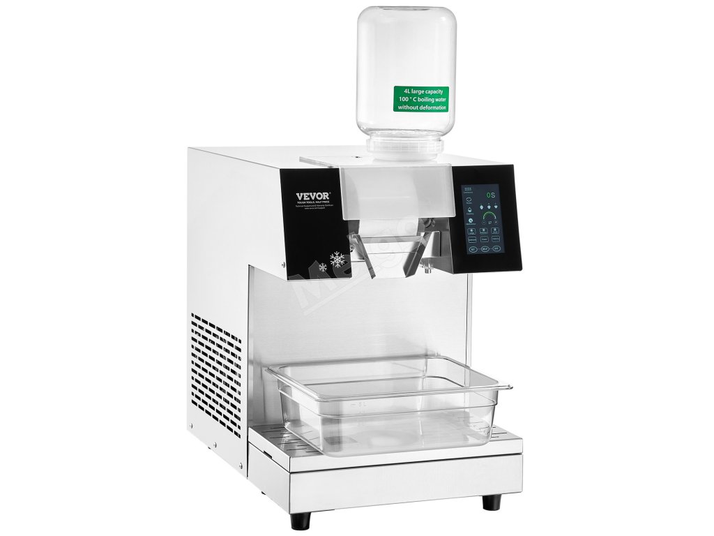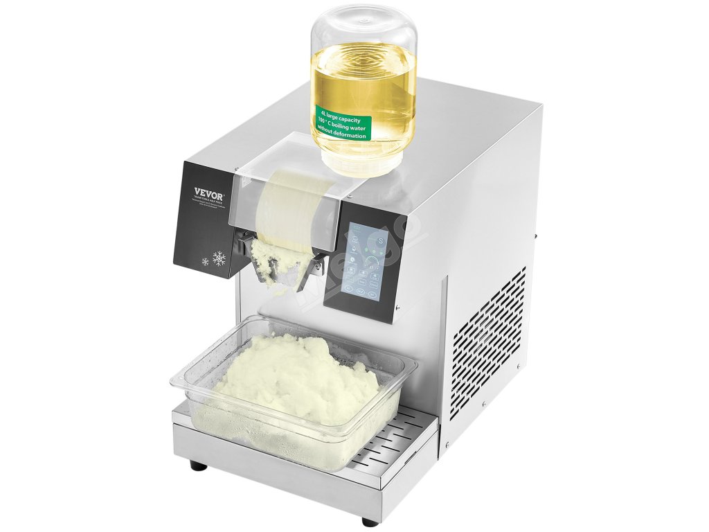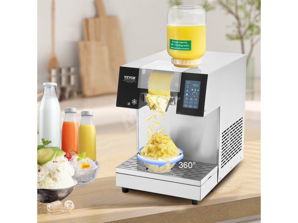Tento vzduchom chladený stroj na výrobu snehových vločiek je vybavený výkonným 700W kompresorom, ktorý dosahuje rýchle chladenie v priebehu 40 sekúnd. Môže sa pochváliť dvoma košmi s objemom 4 l, ktoré dokážu za 24 hodín vyrobiť až 507 libier / 230 kg ľadu, čo je ideálne na vytváranie rôznych druhov mliečnej zmrzliny s rôznou štruktúrou.