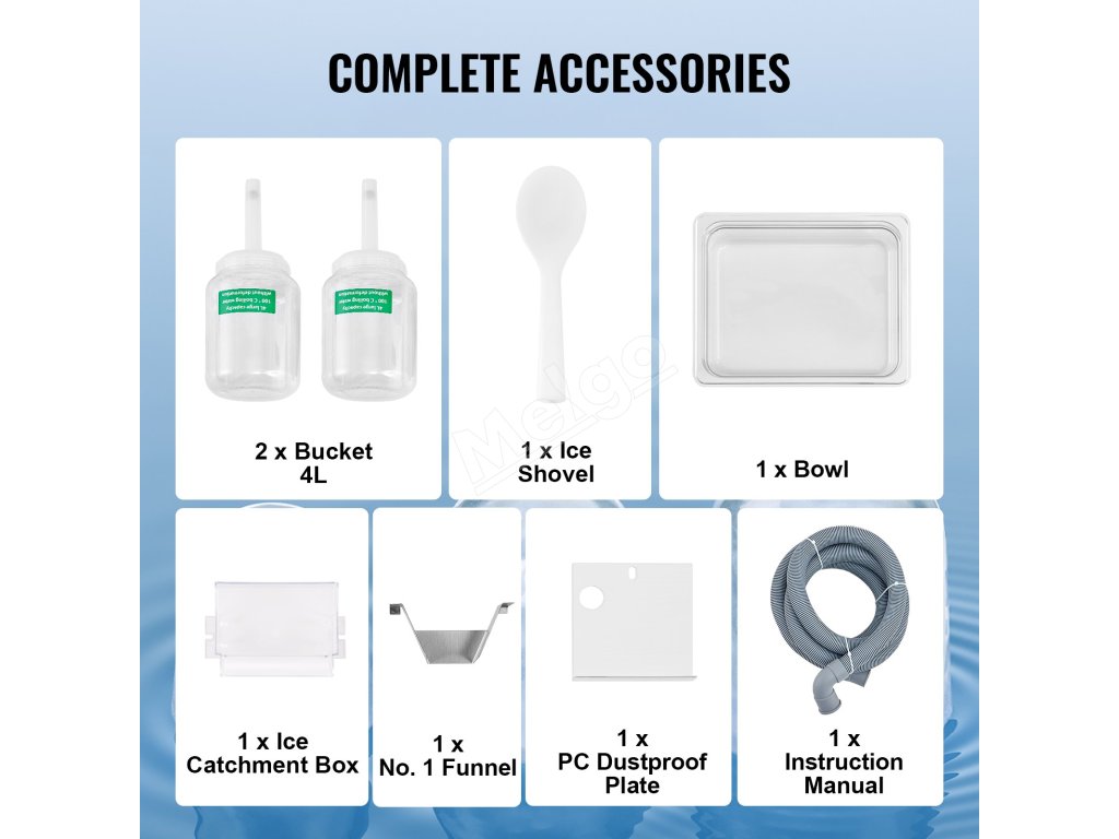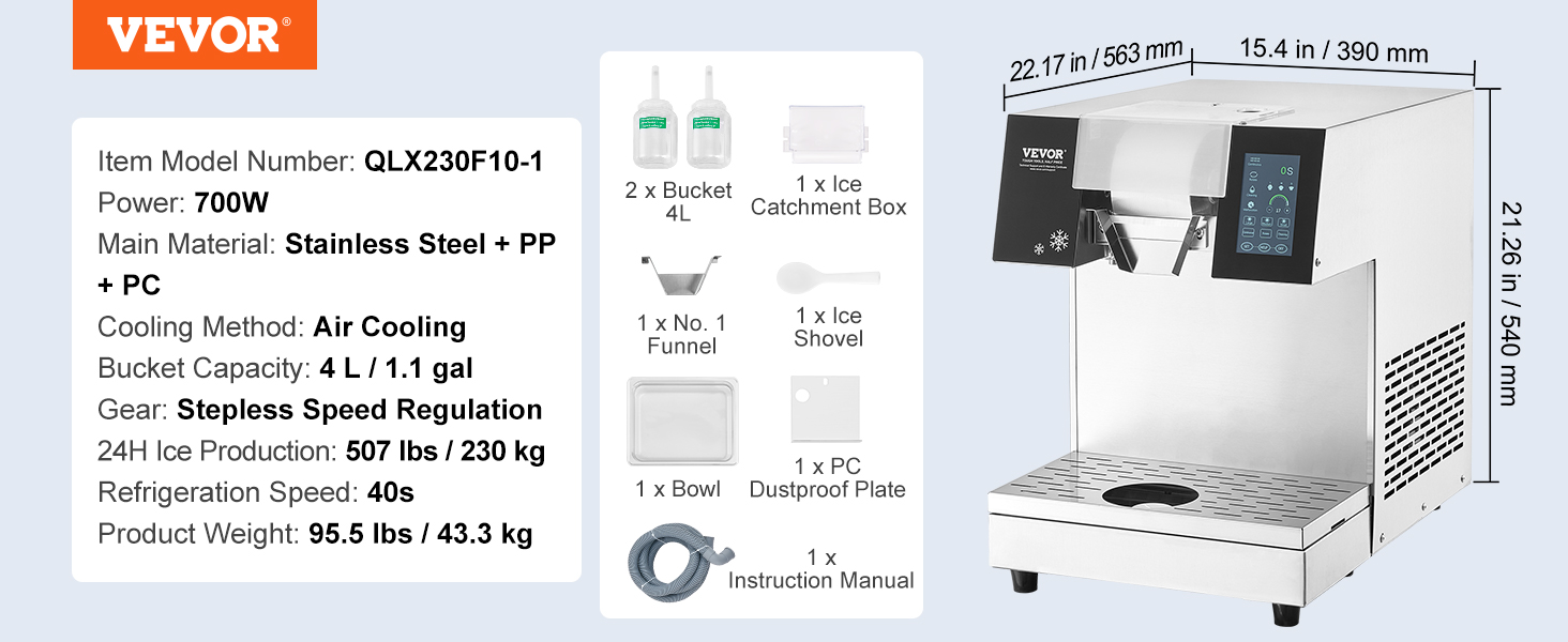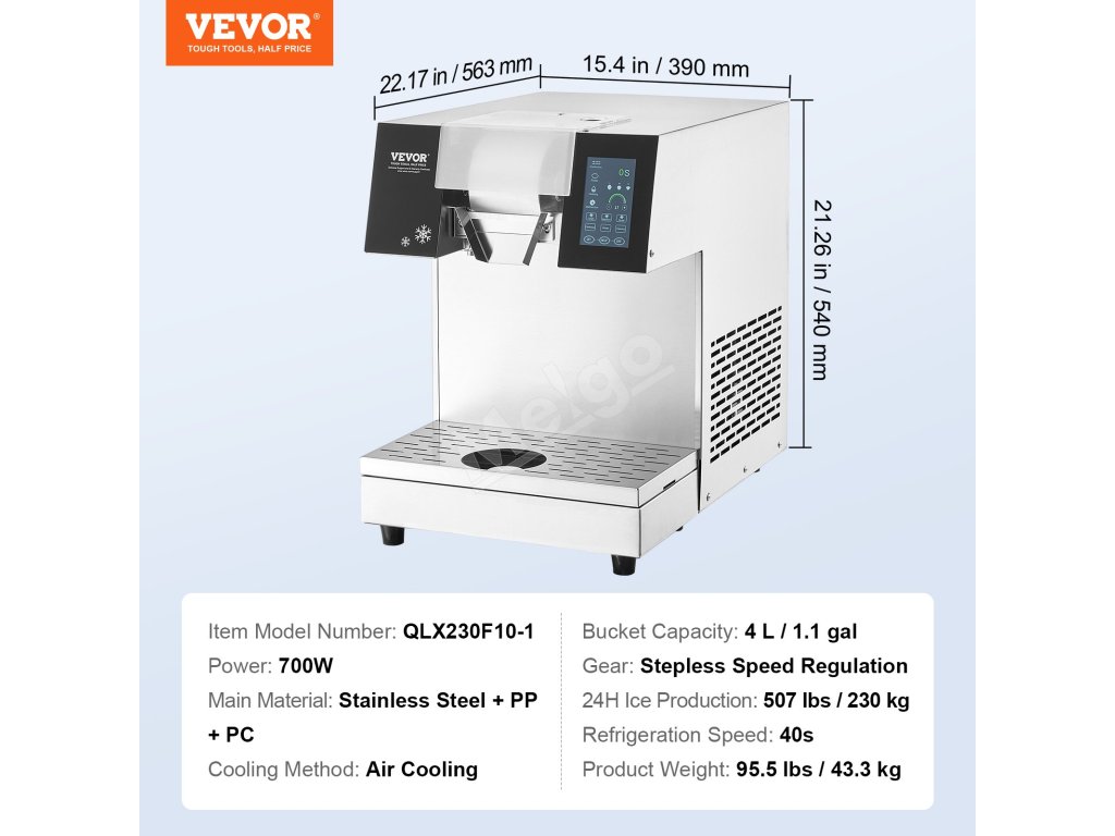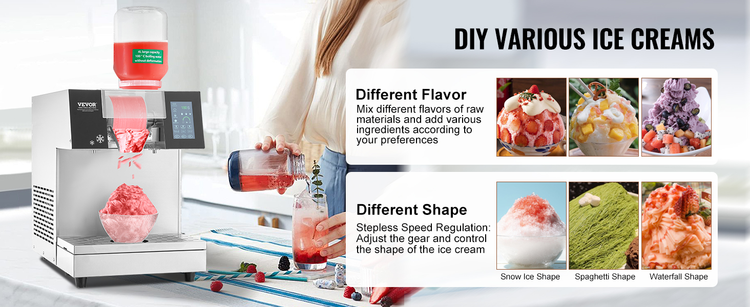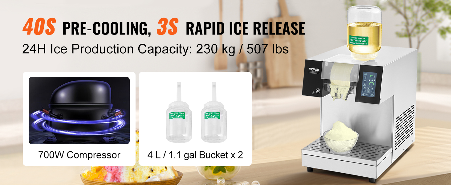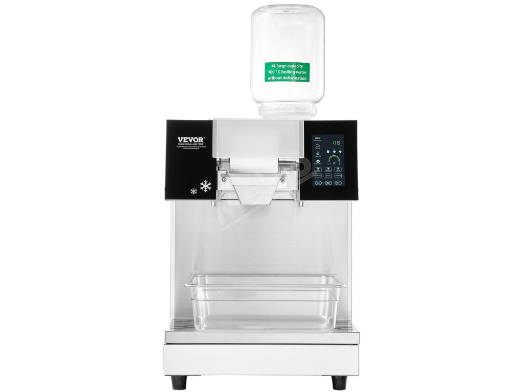 Tento vzduchom chladený stroj na výrobu snehových vločiek je vybavený výkonným 700W kompresorom, ktorý dosahuje rýchle chladenie v priebehu 40 sekúnd. Môže sa pochváliť dvoma košmi s objemom 4 l, ktoré dokážu za 24 hodín vyrobiť až 507 libier / 230 kg ľadu, čo je ideálne na vytváranie rôznych druhov mliečnej zmrzliny s rôznou štruktúrou.