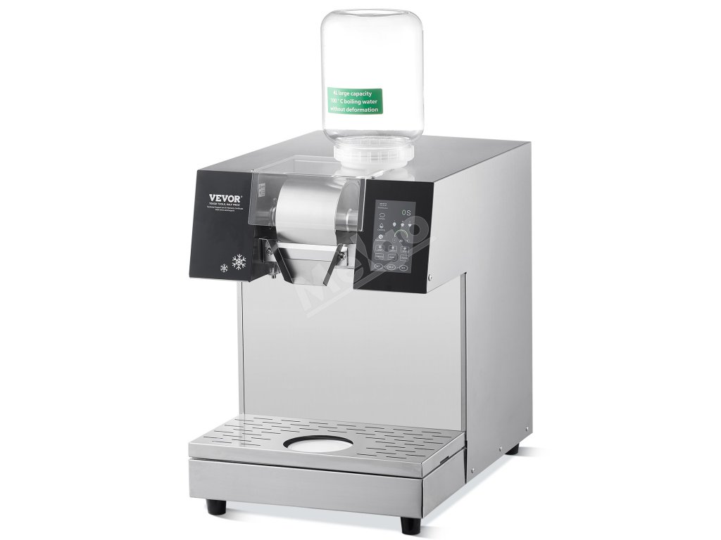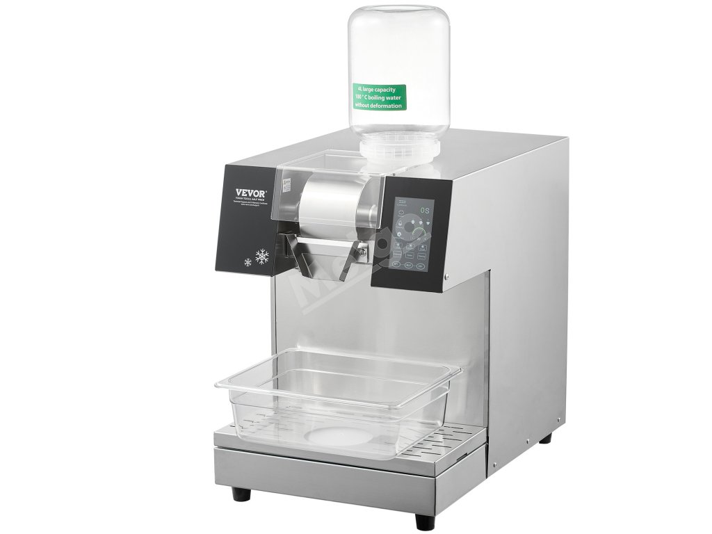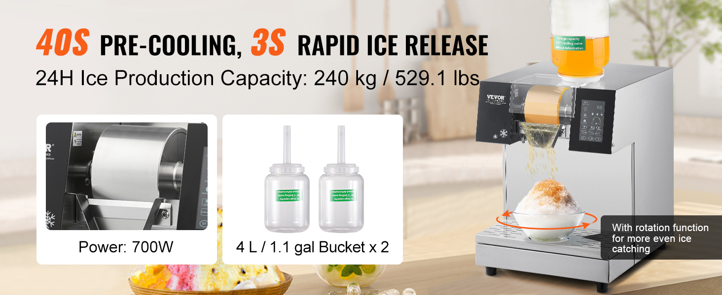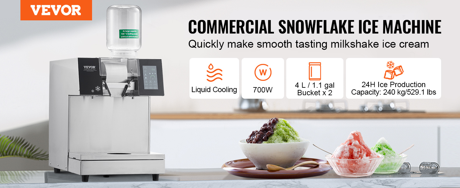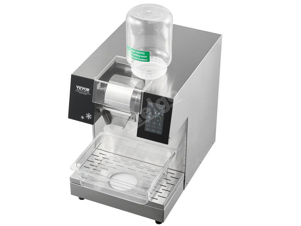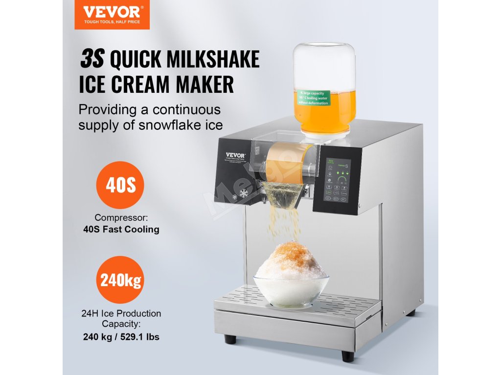 Tento kvapalinou chladený stroj na výrobu snežienok je vybavený výkonným 700W kompresorom, ktorý dosahuje rýchle chladenie v priebehu 40 sekúnd. Môže sa pochváliť dvoma košmi s objemom 4 l, ktoré dokážu za 24 hodín vyrobiť až 529,1 lbs / 240 kg ľadu, čo je ideálne na vytváranie rôznych druhov mliečnej zmrzliny s rôznou textúrou.